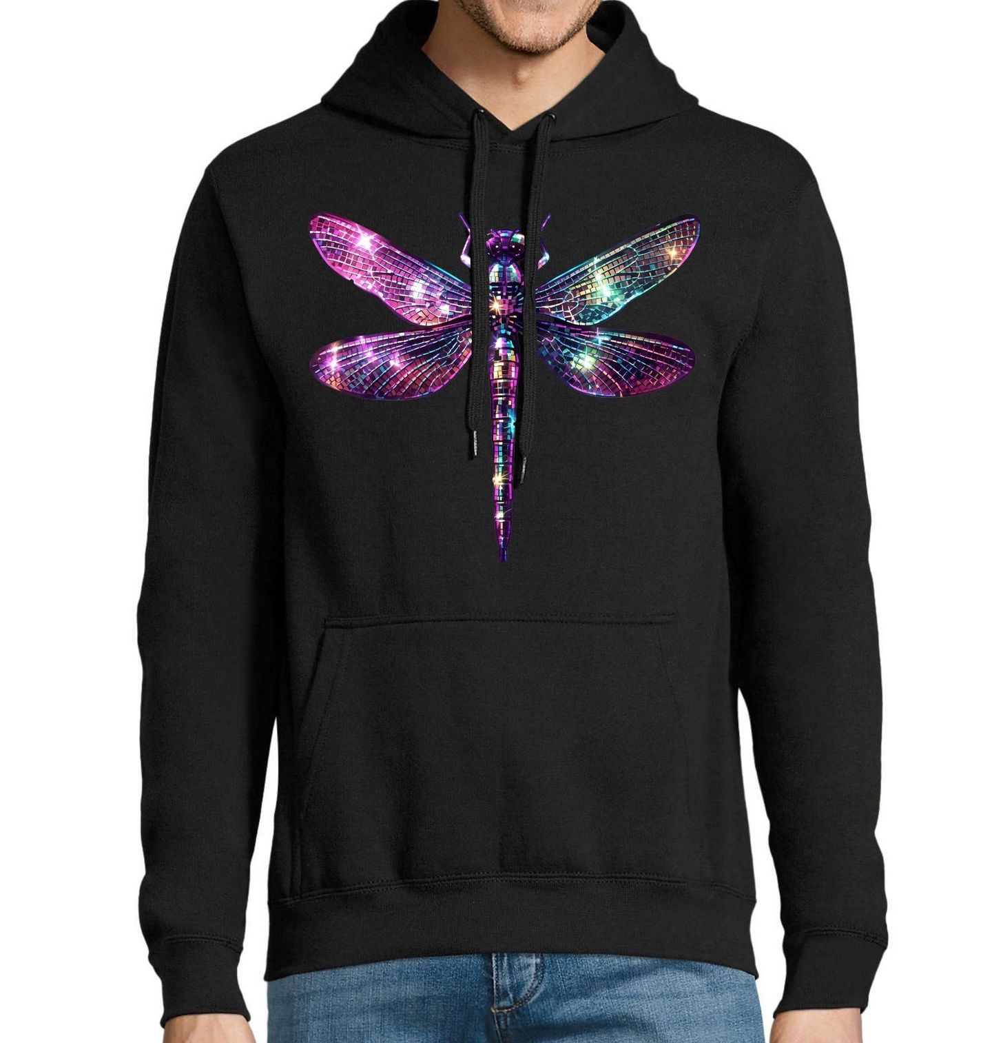 Pánská mikina Třpytivá Vážka. Originální motiv zachycuje vážka v jedinečném stylu inspirovaném leskem disco koulí. Křídla i tělo tvoří barevné odlesky, které vytvářejí efekt světla, pohybu a energie. Tento design spojuje přírodní motiv s moderním a hravým vizuálním zpracováním. Vážka symbolizuje lehkost, svobodu a proměnu, zatímco výrazné barvy a lesklý efekt dodávají motivu dynamiku a originalitu.