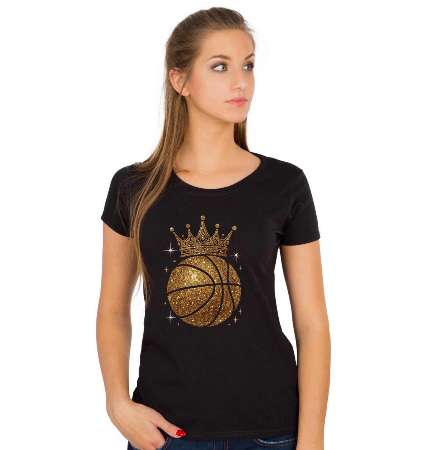 Dámské tričko Třpytivě Zlatý Basketbalový Míč s Korunou