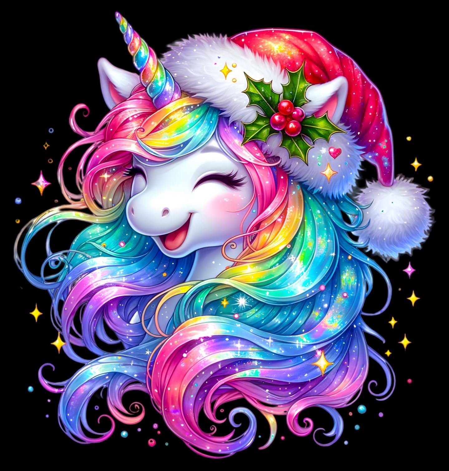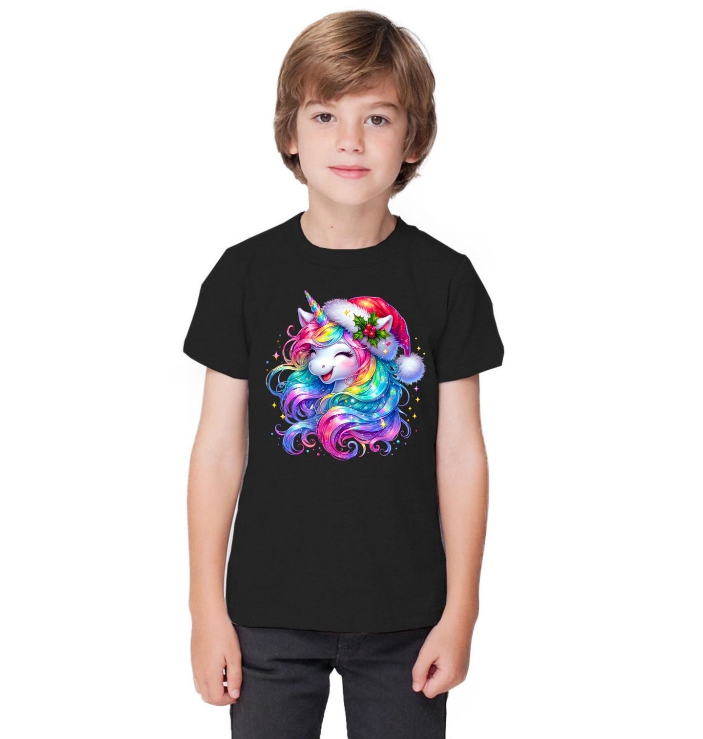 Dětské tričko Třpytivý Vánoční Jednorožec. Tento usměvavý jednorožec s duhovou hřívou, vánoční čepicí a jmelím je dokonalým parťákem na Vánoce – pro děti, které milují pohádky, barvy a kouzelnou atmosféru svátků. Udělejte z letošních Vánoc nezapomenutelné – protože jednorožec je nejlepší kamarád malých snílků.
