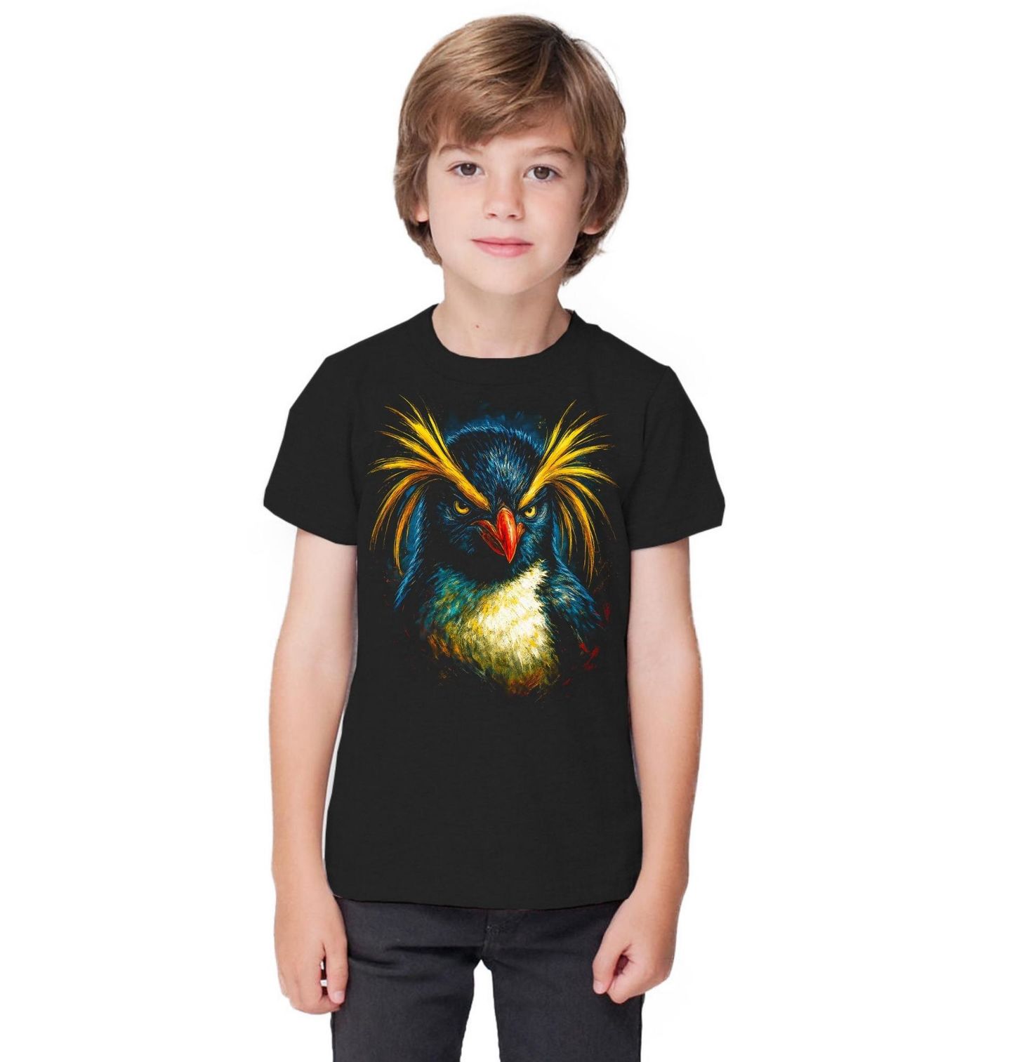 Dětské tričko Tučňák chocholatý. Tučňák chocholatý patří mezi nejcharakterističtější mořské ptáky jižní polokoule a symbolizuje odvahu, vytrvalost a osobitost. Umělecké zpracování zvýrazňuje kontrast barev a energii tohoto druhu, díky čemuž motiv působí silně a nezaměnitelně.