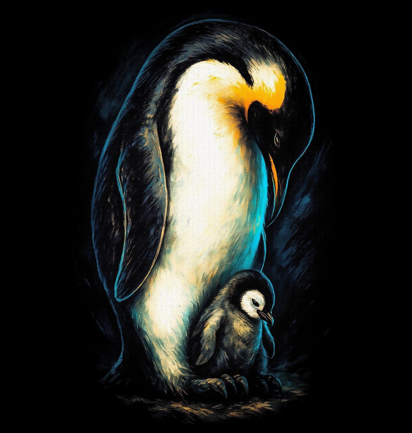 Dámské tričko Tučňák císařský s Mládětem. Tento pták patří mezi největší a nejsilnější druhy tučňáků na světě. Tučňák císařský je známý extrémní odolností, oddaností potomkům a schopností přežít v nejtěžších podmínkách Antarktidy. Umělecké ztvárnění zdůrazňuje jeho majestát i jemnost zároveň.