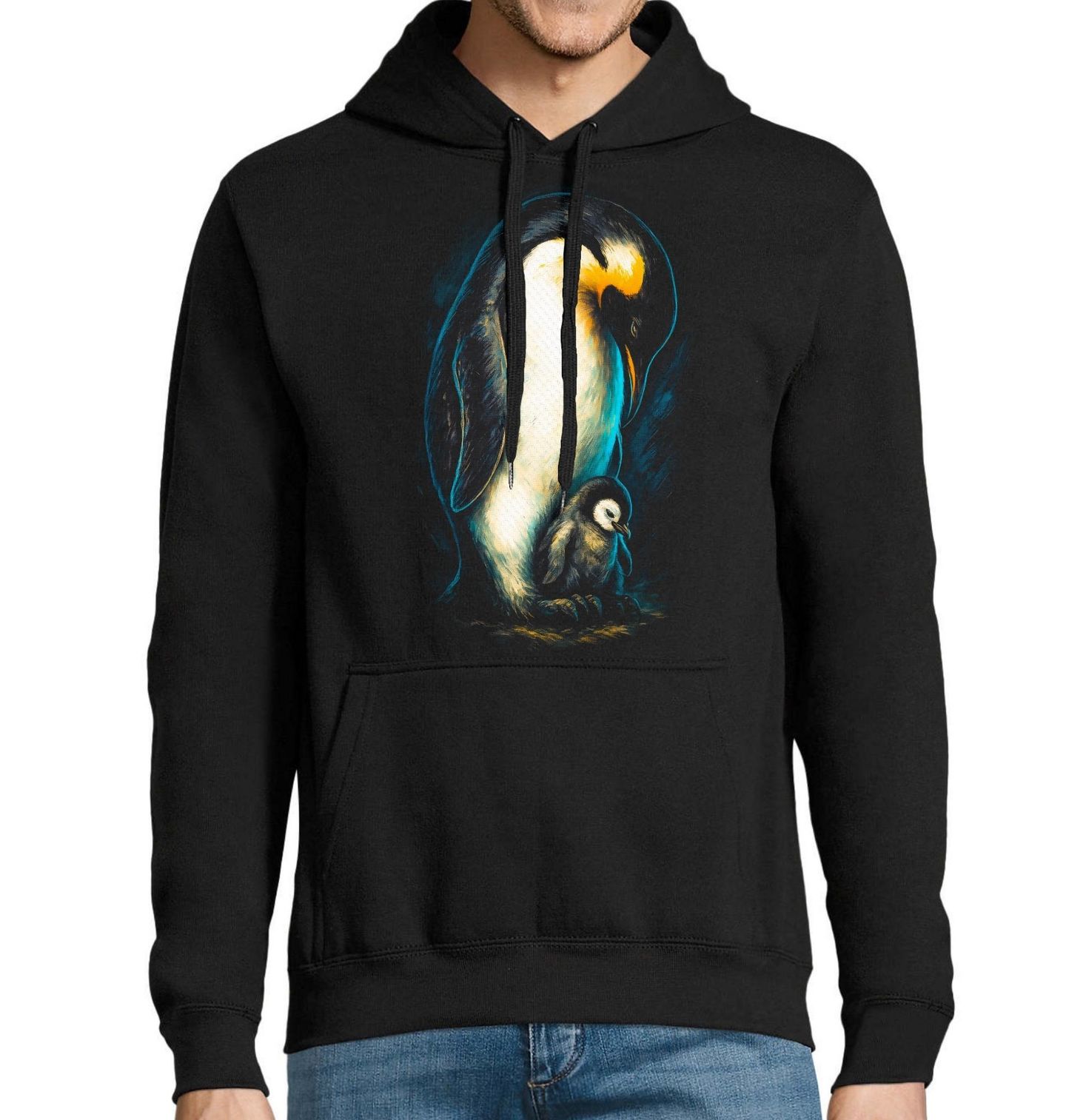 Pánská mikina Tučňák císařský s Mládětem. Tento pták patří mezi největší a nejsilnější druhy tučňáků na světě. Tučňák císařský je známý extrémní odolností, oddaností potomkům a schopností přežít v nejtěžších podmínkách Antarktidy. Umělecké ztvárnění zdůrazňuje jeho majestát i jemnost zároveň.