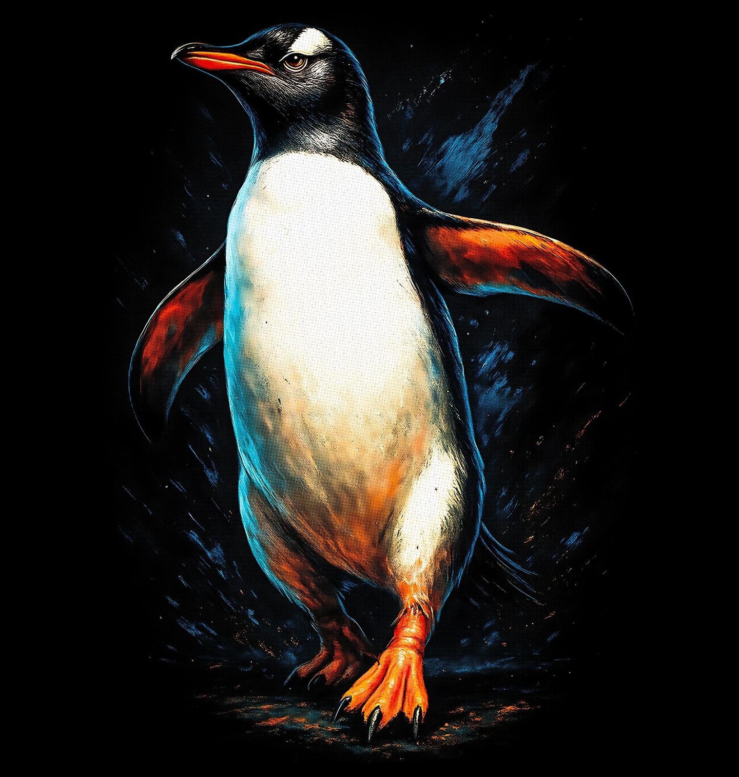 Pánské tričko Tučňák oslí. Zobrazeným druhem je tučňák oslí, jeden z nejrychlejších a nejpohyblivějších tučňáků na světě. Tučňák oslí je známý svou hbitostí ve vodě, výraznou bílou skvrnou nad okem a silnou osobností. Přestože nelétá, patří mezi nejikoničtější ptáky jižní polokoule.