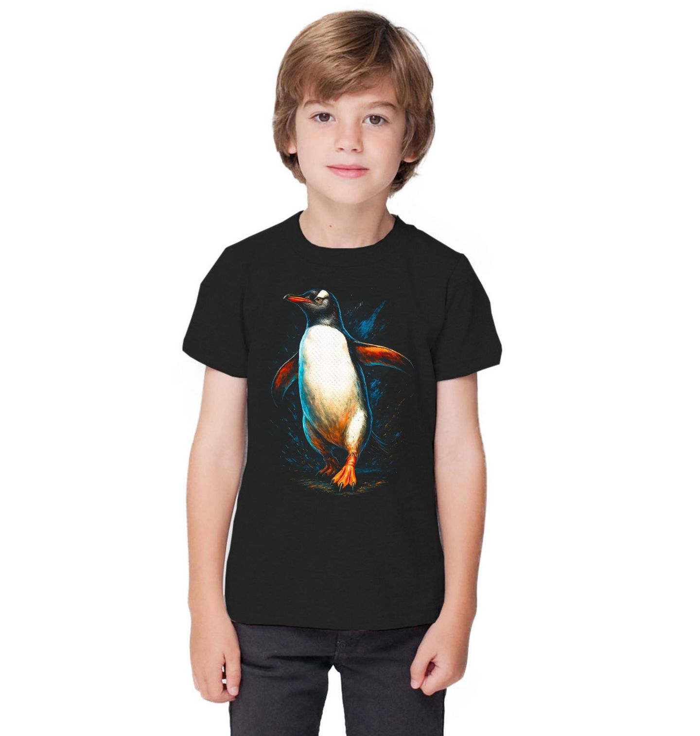 Dětské tričko Tučňák oslí. Zobrazeným druhem je tučňák oslí, jeden z nejrychlejších a nejpohyblivějších tučňáků na světě. Tučňák oslí je známý svou hbitostí ve vodě, výraznou bílou skvrnou nad okem a silnou osobností. Přestože nelétá, patří mezi nejikoničtější ptáky jižní polokoule.