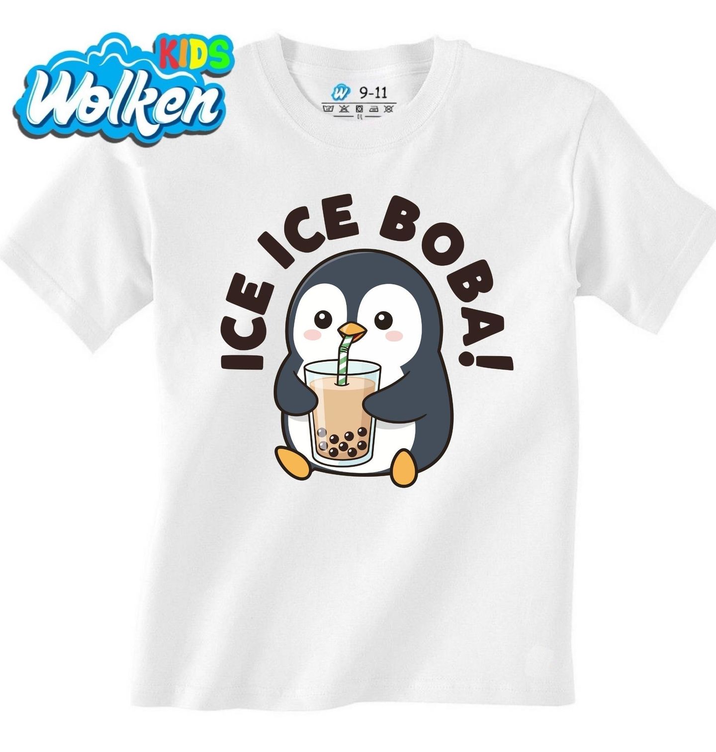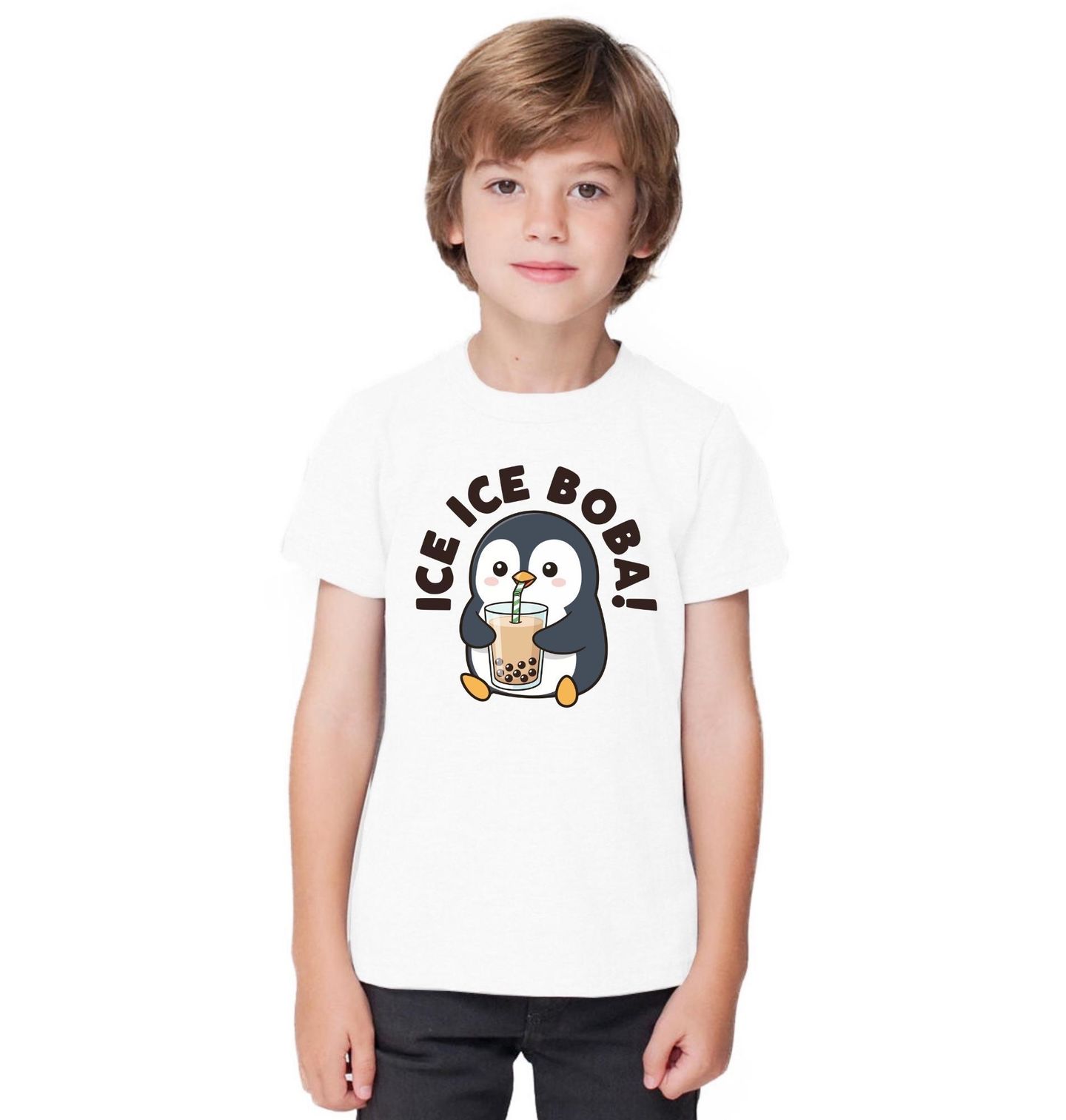 Dětské tričko Tučňák s Bubble Tea Ice Ice Boba! BOBA. Rozkošný motiv s usměvavým tučňákem, který si s chutí dává sklenici ledového bubble tea, potěší každého milovníka sladkých nápojů i zimní roztomilosti. Spojení bubble tea a chladného prostředí vytváří ideální obrázek pro fanoušky arktických zvířátek, kawaii stylu a bublinkových chutí.