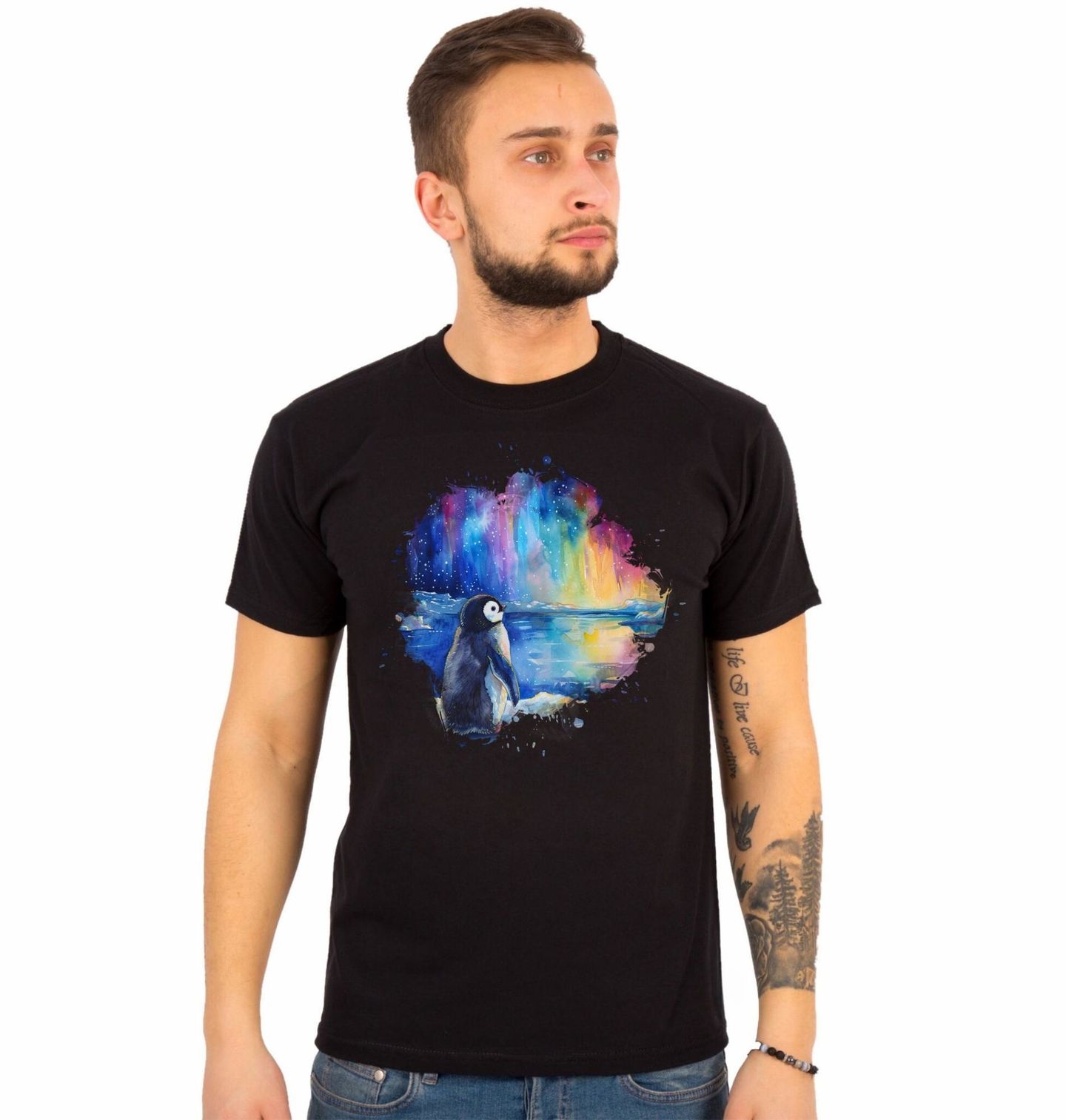 Pánské tričko Tučňák u Jezera pod Polární Září. Tento kouzelný motiv zachycuje tichý okamžik, kdy tučňák stojí na břehu ledového jezera a pozoruje oblohu rozzářenou barvami, které připomínají pohádku. Jemná akvarelová ilustrace vytváří snovou atmosféru, ve které se noc mění v magické divadlo světla a klidu. Dominantním prvkem je polární záře, jejíž barvy se odrážejí na hladině vody a dodávají motivu pocit tepla i v chladné krajině.