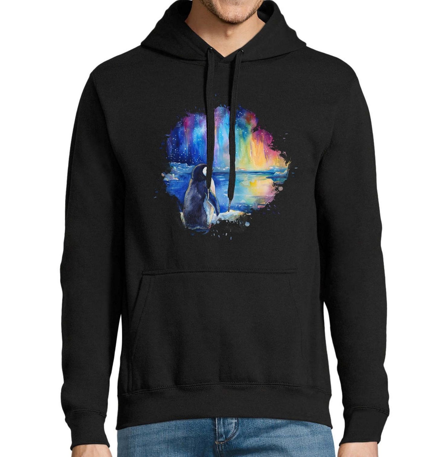 Pánská mikina Tučňák u Jezera pod Polární Září. Tento kouzelný motiv zachycuje tichý okamžik, kdy tučňák stojí na břehu ledového jezera a pozoruje oblohu rozzářenou barvami, které připomínají pohádku. Jemná akvarelová ilustrace vytváří snovou atmosféru, ve které se noc mění v magické divadlo světla a klidu. Dominantním prvkem je polární záře, jejíž barvy se odrážejí na hladině vody a dodávají motivu pocit tepla i v chladné krajině.