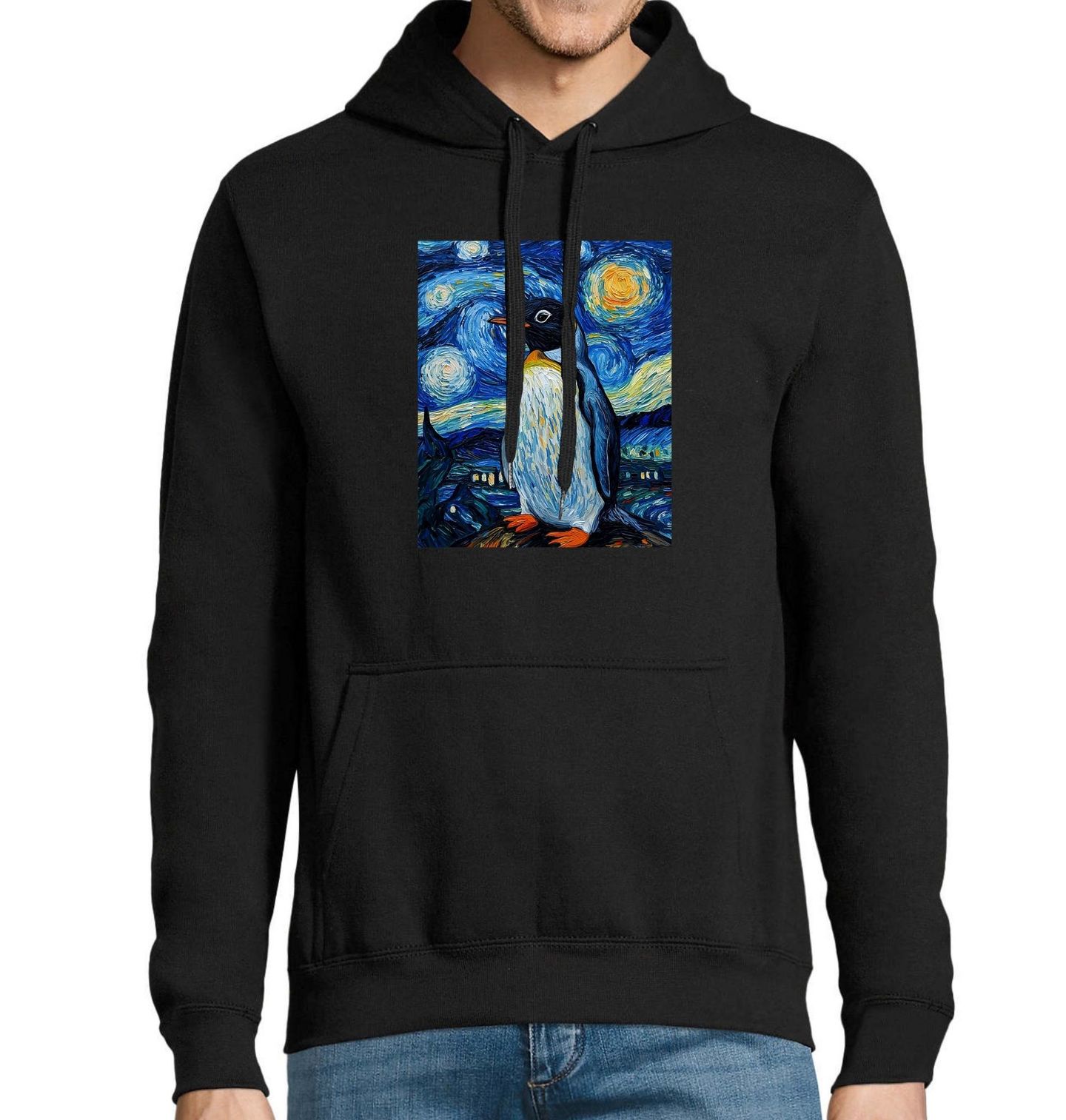 Pánská mikina Tučňák ve Hvězdné noci. Objevte originální tričko s motivem tučnáka, zasazeného do ikonické kompozice obrazu Hvězdná noc od Vincenta van Gogha. Toto umělecké spojení chladu Antarktidy a horké expresivity postimpresionismu zaujme každého milovníka zvířat, barev i umění.