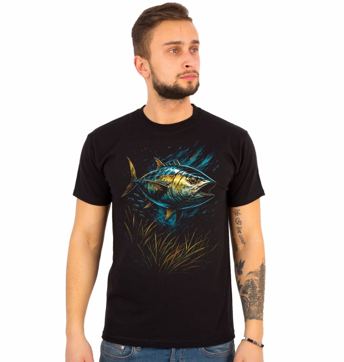 Pánské tričko Tuňák žlutoploutvý. Zobrazeným druhem je tuňák žlutoploutvý, jedna z nejikoničtějších ryb sportovního i komerčního rybaření. Tuňák žlutoploutvý je proslulý svou extrémní rychlostí, vytrvalostí a tvrdým soubojem po záběru. Právě proto patří mezi vysněné úlovky, které každý zkušený rybář bere s maximálním respektem.