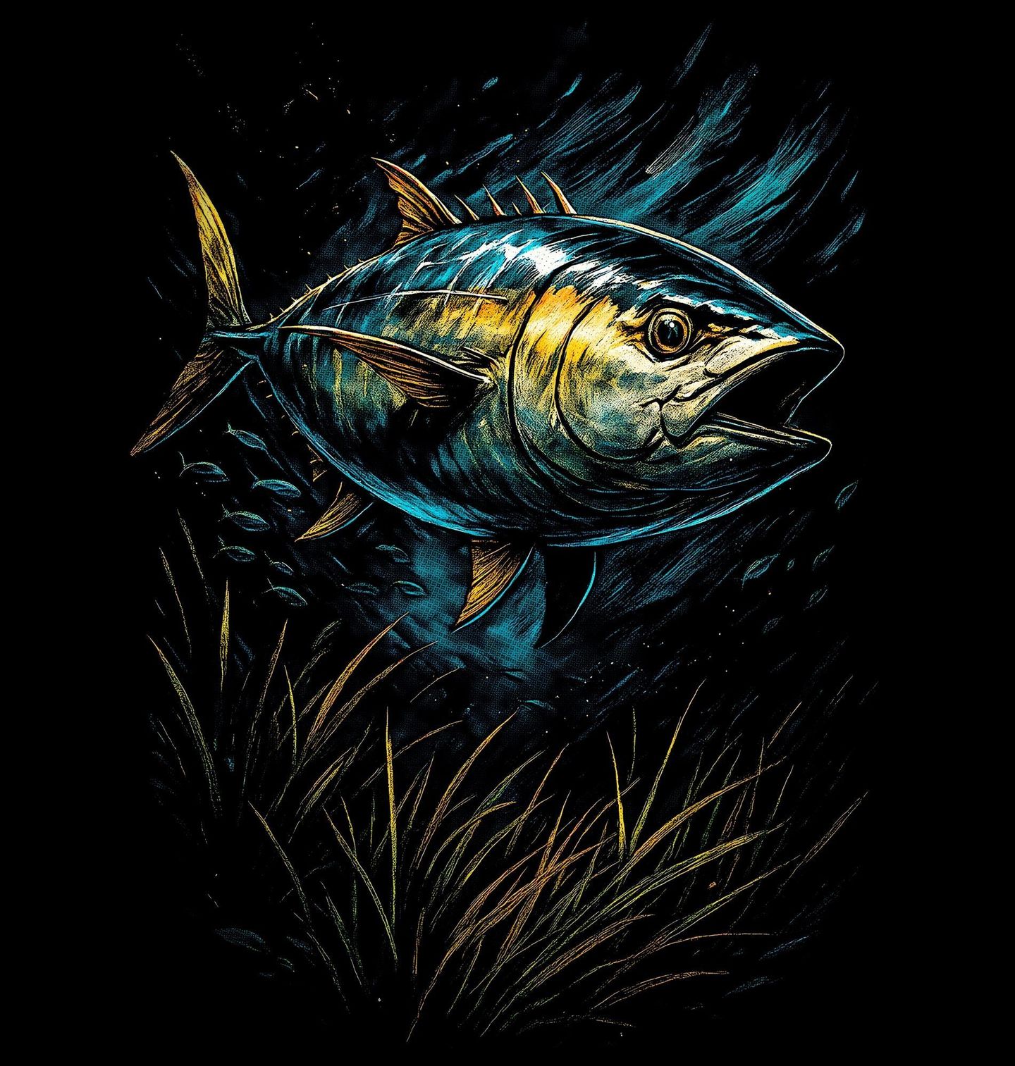 Dětské tričko Tuňák žlutoploutvý. Zobrazeným druhem je tuňák žlutoploutvý, jedna z nejikoničtějších ryb sportovního i komerčního rybaření. Tuňák žlutoploutvý je proslulý svou extrémní rychlostí, vytrvalostí a tvrdým soubojem po záběru. Právě proto patří mezi vysněné úlovky, které každý zkušený rybář bere s maximálním respektem.