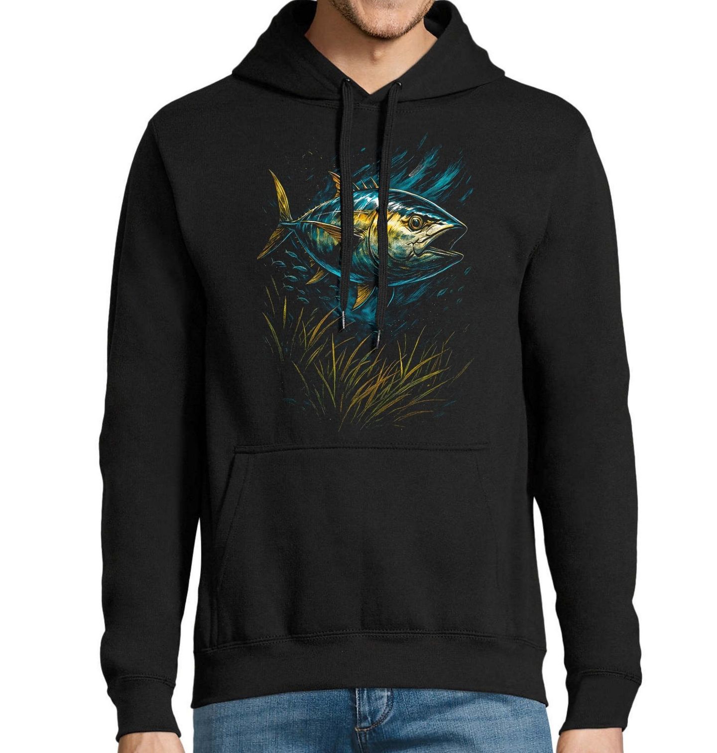Pánská mikina Tuňák žlutoploutvý. Zobrazeným druhem je tuňák žlutoploutvý, jedna z nejikoničtějších ryb sportovního i komerčního rybaření. Tuňák žlutoploutvý je proslulý svou extrémní rychlostí, vytrvalostí a tvrdým soubojem po záběru. Právě proto patří mezi vysněné úlovky, které každý zkušený rybář bere s maximálním respektem.