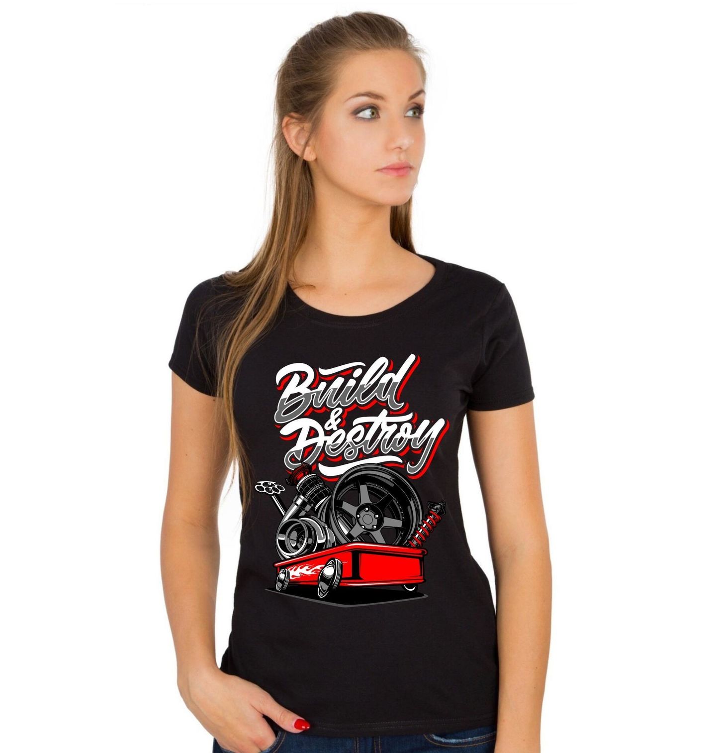 Dámské tričko Tuningové Díly Build & Destroy. Výrazný motiv pro všechny, kteří milují rychlost, úpravy a vůni benzínu. Design zachycuje klíčové tuningové díly – turbo, sportovní tlumič, závodní kolo a podvozek – připravené proměnit každé auto v nekompromisní stroj. Agresivní grafika a kontrastní barvy podtrhují sílu a energii, kterou přináší správně upravené auto.