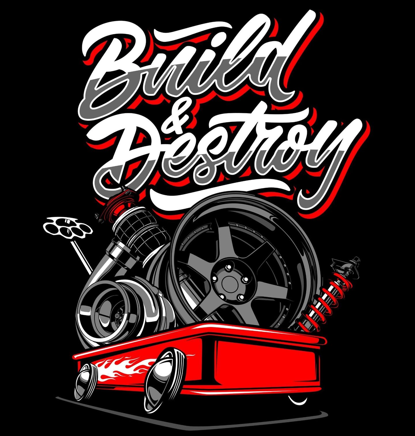 Dětské tričko Tuningové Díly Build & Destroy. Výrazný motiv pro všechny, kteří milují rychlost, úpravy a vůni benzínu. Design zachycuje klíčové tuningové díly – turbo, sportovní tlumič, závodní kolo a podvozek – připravené proměnit každé auto v nekompromisní stroj. Agresivní grafika a kontrastní barvy podtrhují sílu a energii, kterou přináší správně upravené auto.