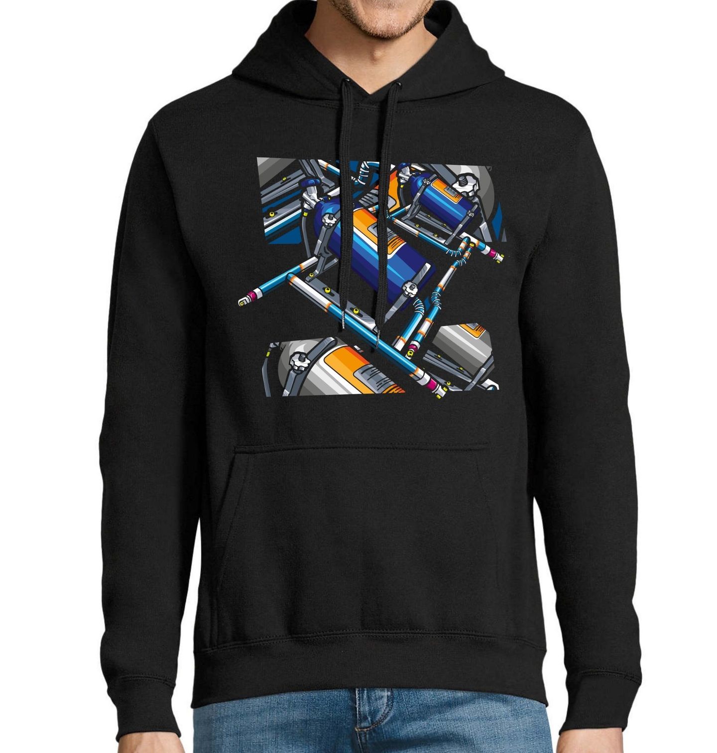 Pánská mikina Tuningové Láhve Dual Nitrous Bottle. Moderní tuningový motiv inspirovaný světem motorsportu a úprav výkonu zobrazuje detailní instalaci tlakových lahví v kufru, které slouží jako nitro systém pro auto. Jde o tzv. NOS (oxid dusný), tedy zařízení používané v tuningu ke krátkodobému zvýšení výkonu motoru – po aktivaci dodá více kyslíku do spalování a auto získá výrazný boost při akceleraci.