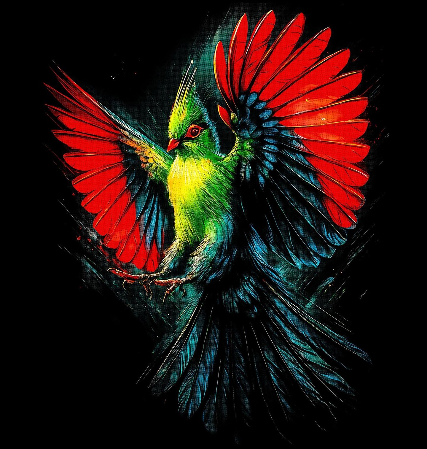 Pánské tričko Turako Schalowův. Schalowův turaco je frugivožravý pták z čeledi Musophagidae. Turako červenokřídlý je pták symbolizující svobodu, energii a výjimečnost. Umělecké zpracování zdůrazňuje pohyb, rozlet a barevnou explozi proti tmavému pozadí, díky čemuž motiv působí moderně, odvážně a velmi živě.