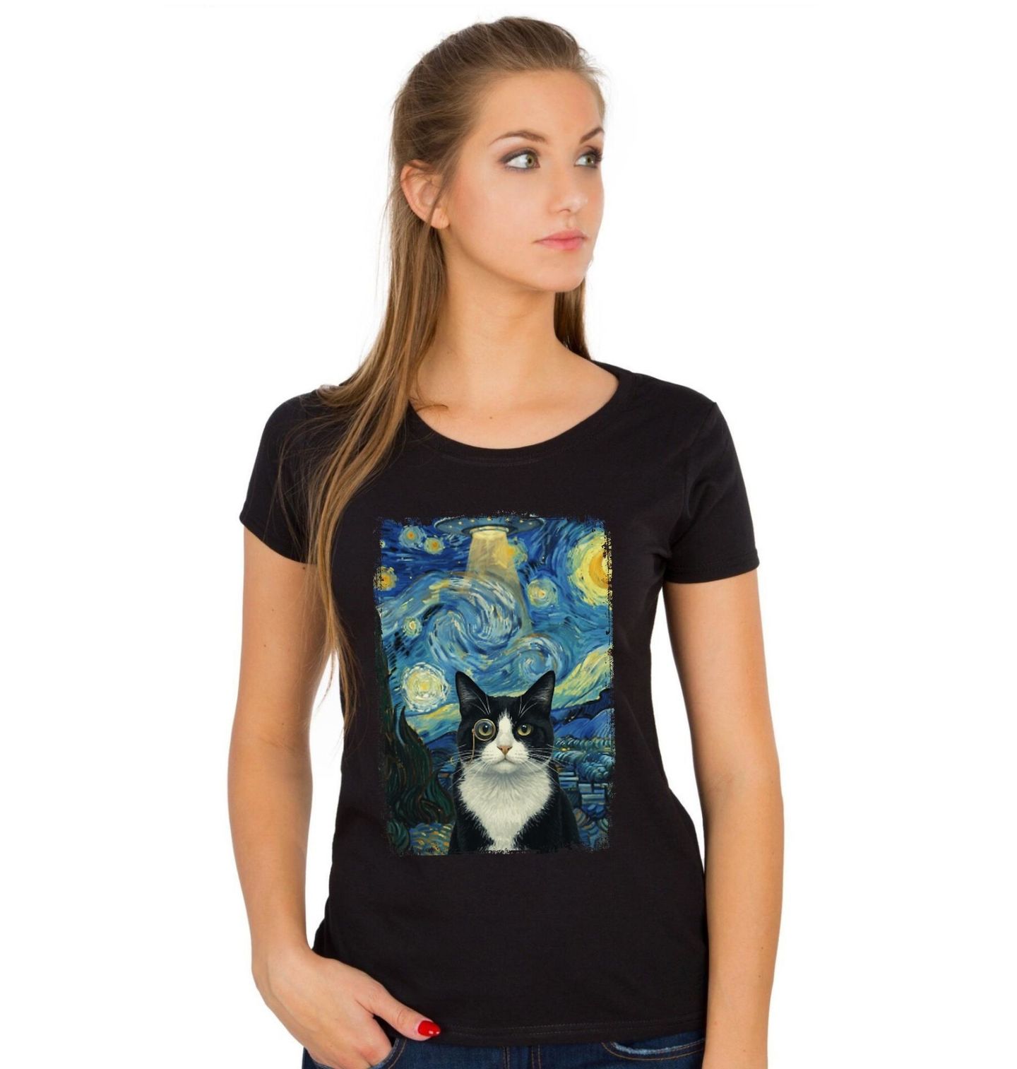 Dámské tričko Tuxedo Kočka ve Hvězdné Noci. Elegantní tuxedo kočka s monoklem před ikonickým pozadím inspirovaným obrazem Hvězdná noc, který namaloval slavný malíř Vincent van Gogh. UFO vznášející se nad kočkou a tajemná atmosféra oblohy dodávají scéně umělecký i magický nádech. Tento motiv je ideální pro milovníky koček i klasického malířství.