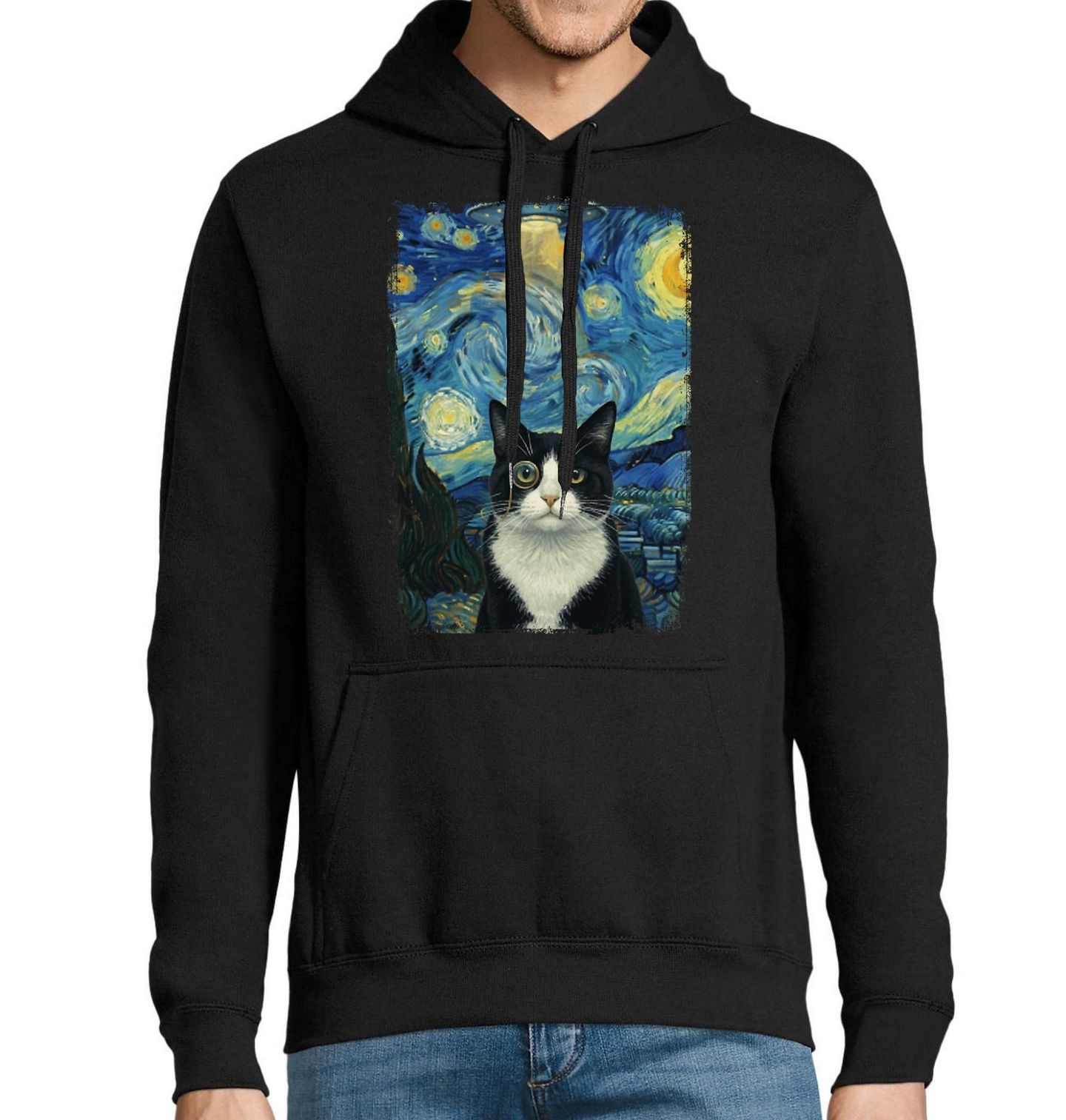 Pánská mikina Tuxedo Kočka ve Hvězdné Noci. Elegantní tuxedo kočka s monoklem před ikonickým pozadím inspirovaným obrazem Hvězdná noc, který namaloval slavný malíř Vincent van Gogh. UFO vznášející se nad kočkou a tajemná atmosféra oblohy dodávají scéně umělecký i magický nádech. Tento motiv je ideální pro milovníky koček i klasického malířství.