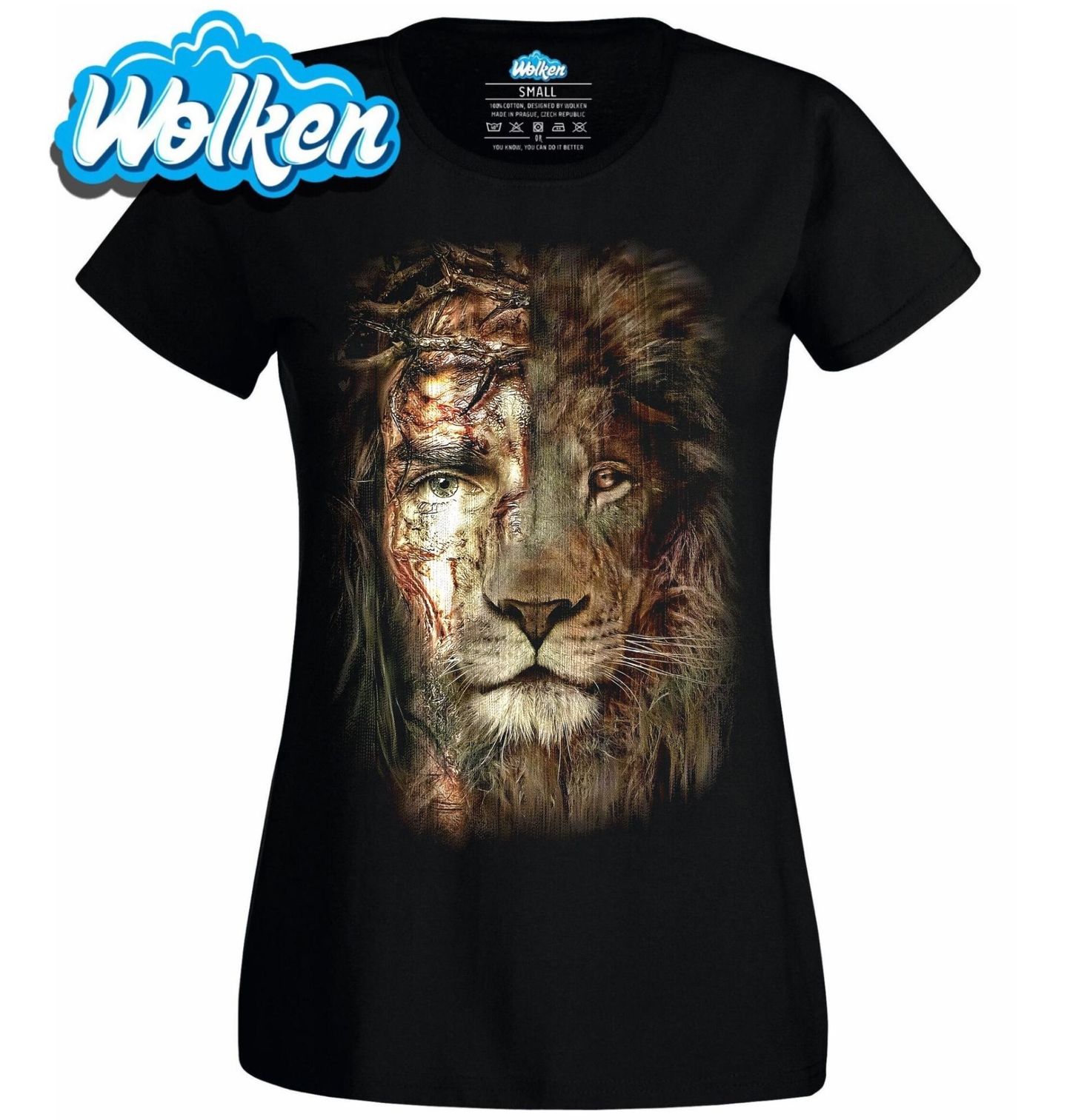 Dámské tričko Tvář Ježíše a Lva. Silný náboženský motiv spojující dvě klíčové postavy víry – Ježíš s trnovou korunou a ušlechtilý lev, tradiční symbol síly a královské důstojnosti. Tento design osloví každého, koho zajímá náboženství, víra a duchovní symbolika. Motiv zobrazuje Ježíšovu tvář plnou bolesti a lásky, výraz majestátního lva, který zastupuje odvahu, ochranu a pravdu.