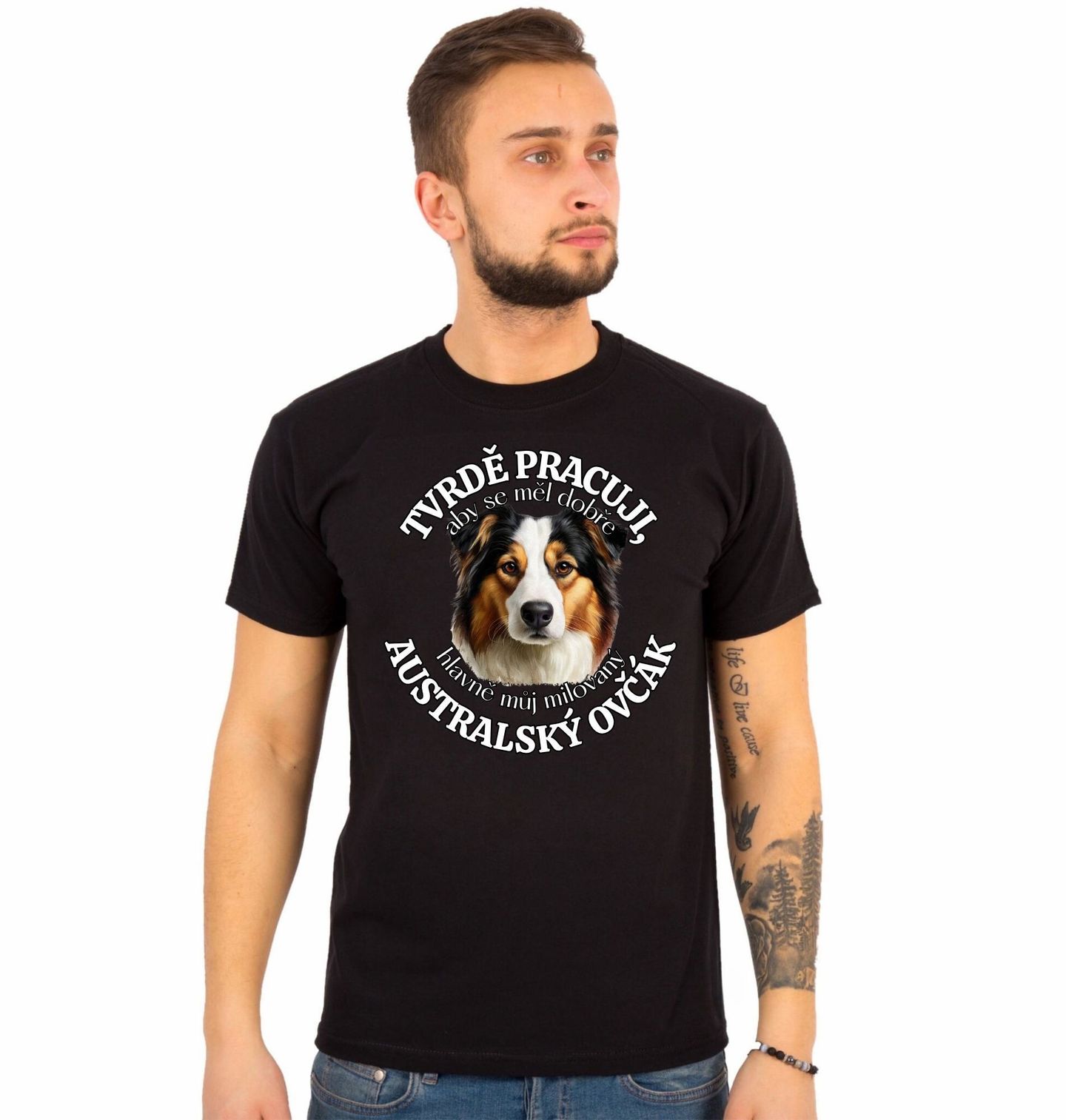 Pánské tričko Tvrdě pracuji, aby se měl dobře můj Australský ovčák. Originální motiv pro každého, kdo ví, že pes je součást rodiny a každodenní radost. Tento design s plemenem australský ovčák potěší každého, kdo je hrdý pejskař a miluje svého psa. Australský ovčák je oblíbená rasa psa známá svou inteligencí, energií a věrností. Skvělý dárek pro všechny milovníky psů, kteří chtějí ukázat, jak moc pro ně jejich pes znamená a že mu dopřávají to nejlepší.