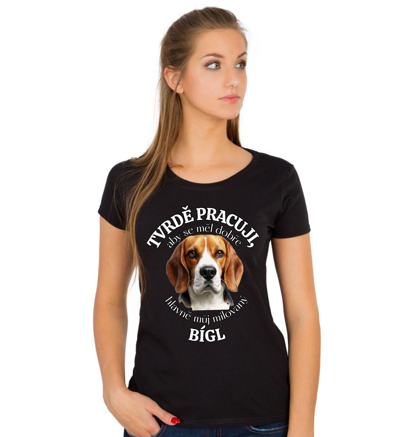 Dámské tričko Tvrdě pracuji, aby se měl dobře můj Bígl. Stylový motiv pro každého, kdo ví, že pes je skutečný parťák do života. Tento design s plemenem bígl potěší každého, kdo je hrdý pejskař a miluje svého čtyřnohého kamaráda. Bígl je oblíbená rasa psa známá svou přátelskou povahou, energií a skvělým čichem, díky kterému je nejen skvělým společníkem, ale i aktivním parťákem.