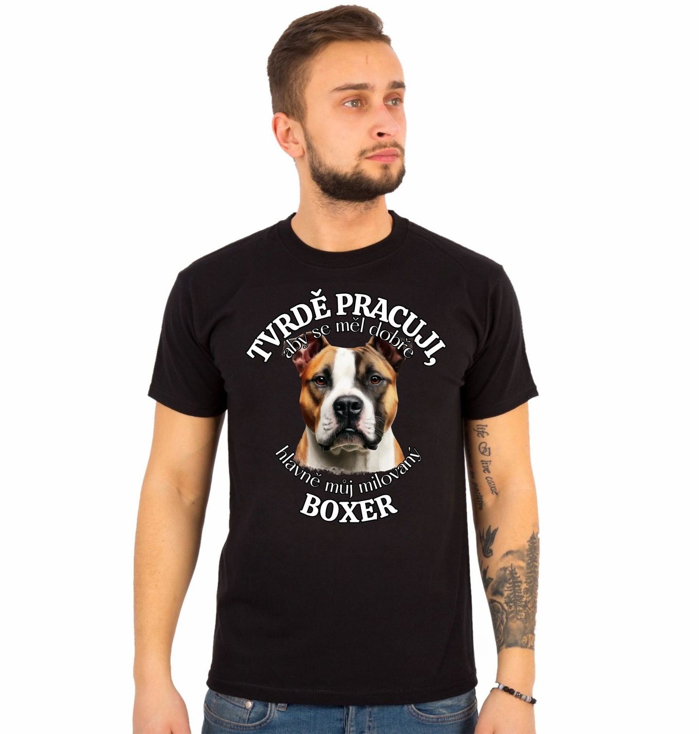 Pánské tričko Tvrdě pracuji, aby se měl dobře můj Boxer. Výrazný motiv pro všechny, kteří vědí, že pes je věrný společník a nejlepší přítel. Tento design s plemenem boxer osloví každého, kdo je hrdý pejskař a miluje svého psa. Boxer je oblíbená rasa psa známá svou energií, odvahou a oddaností rodině. Ideální volba pro každého, kdo chce stylově ukázat, jak moc pro něj jeho pes znamená a že pro něj dělá maximum každý den.