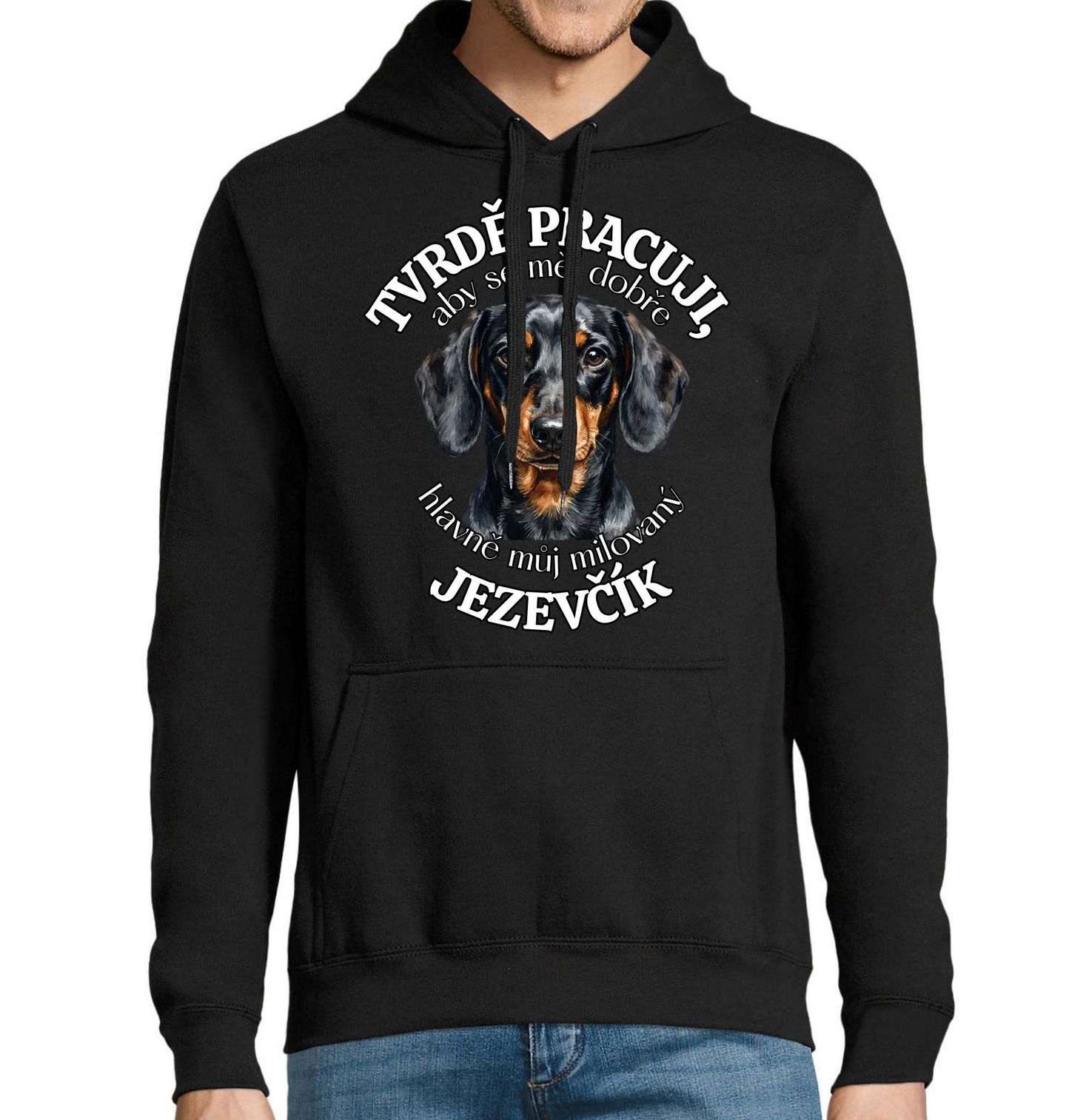 Pánská mikina Tvrdě pracuji, aby se měl dobře můj Jezevčík. Jezevčík je odvážný, inteligentní a velmi oddaný pes s velkou osobností v malém těle. Tato rasa psa je známá svou hravostí, tvrdohlavostí i velkým srdcem, díky čemuž si získala oblibu po celém světě. Každý pejskař ocení jeho jedinečný charakter a nekonečnou energii. Tento design s vtipným textem vystihuje realitu mnoha majitelů – každý pejskař ví, že pro svého čtyřnohého kamaráda udělá maximum.