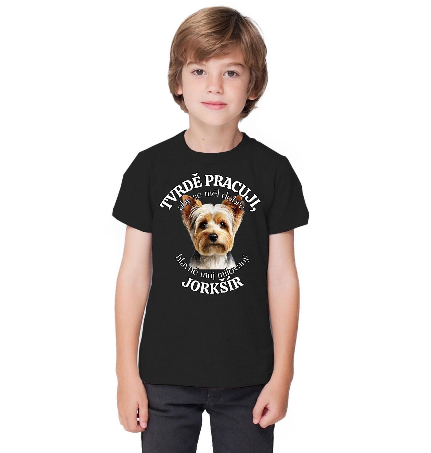 Dětské tričko Tvrdě pracuji, aby se měl dobře můj Jorkšír. Roztomilý a stylový motiv pro každého, kdo ví, že pes je malý, ale důležitý člen rodiny. Tento design s plemenem jorkšír (jorkšírský teriér) zaujme jemným a elegantním vzhledem. Ideální pro každého, kdo je hrdý pejskař a miluje svého malého, ale odvážného psa. Jorkšír je známý svou energií, inteligencí a oddaností, což z něj dělá skvělého společníka.