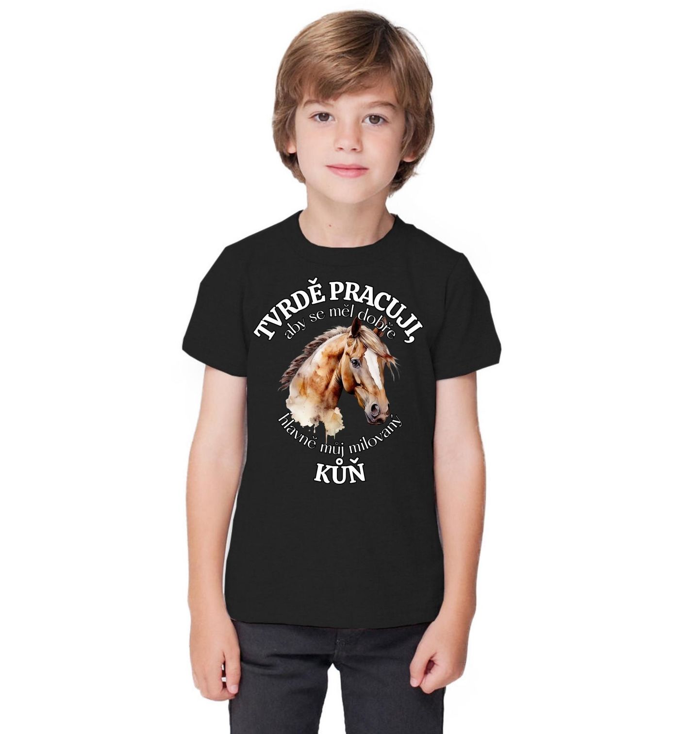 Dětské tričko Tvrdě pracuji, aby se měl dobře můj Kůň. Elegantní motiv pro všechny milovníky koní a života kolem nich. Kůň je symbolem svobody, síly a přátelství mezi člověkem a zvířetem. Tento design vystihuje hluboký vztah, který si každý majitel buduje se svým koněm každý den. Ideální pro každého, kdo ví, že kůň není jen zvíře, ale parťák na celý život, o kterého je třeba se starat s láskou a péčí.
