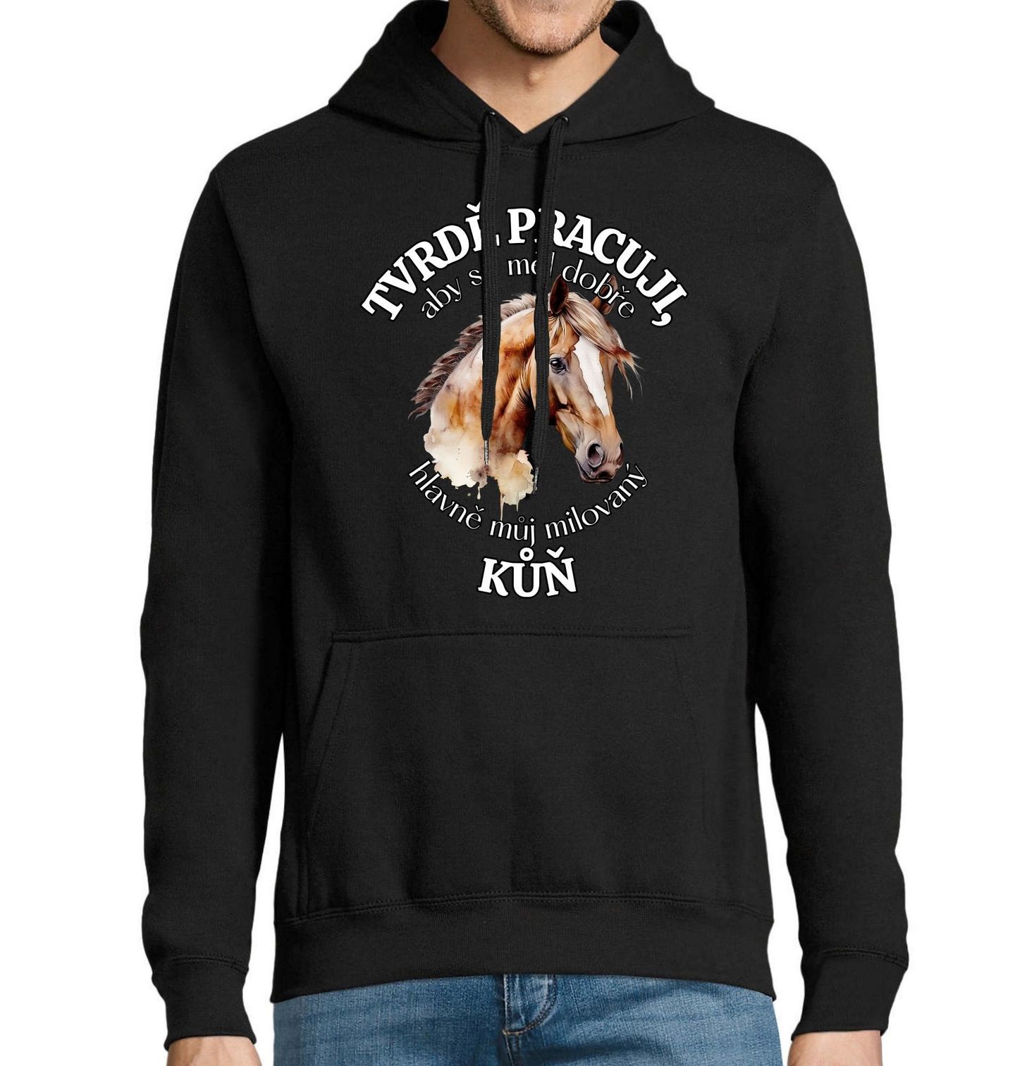 Pánská mikina Tvrdě pracuji, aby se měl dobře můj Kůň. Elegantní motiv pro všechny milovníky koní a života kolem nich. Kůň je symbolem svobody, síly a přátelství mezi člověkem a zvířetem. Tento design vystihuje hluboký vztah, který si každý majitel buduje se svým koněm každý den. Ideální pro každého, kdo ví, že kůň není jen zvíře, ale parťák na celý život, o kterého je třeba se starat s láskou a péčí.