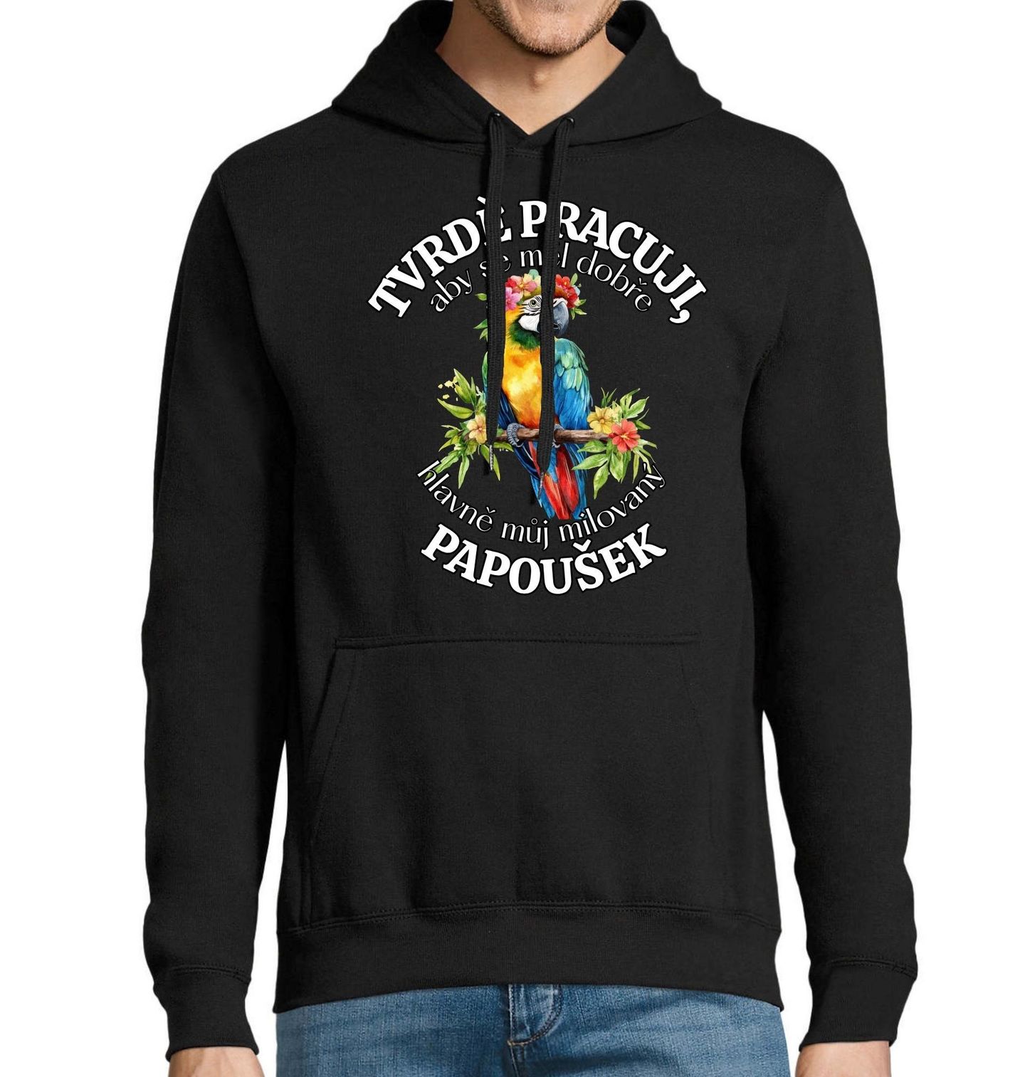 Pánská mikina Tvrdě pracuji, aby se měl dobře můj Papoušek Ara. Barevný a originální motiv pro každého, kdo ví, že papoušek je víc než jen domácí mazlíček. Tento design potěší každého, kdo miluje ptáky a chce dát najevo svou radost z chovu. Papoušek je inteligentní a společenský pták, který si vytváří silné pouto se svým majitelem. Ideální dárek pro každého, kdo má doma papouška a chce stylově ukázat, jak důležitý je pro něj jeho pták a každodenní společník.