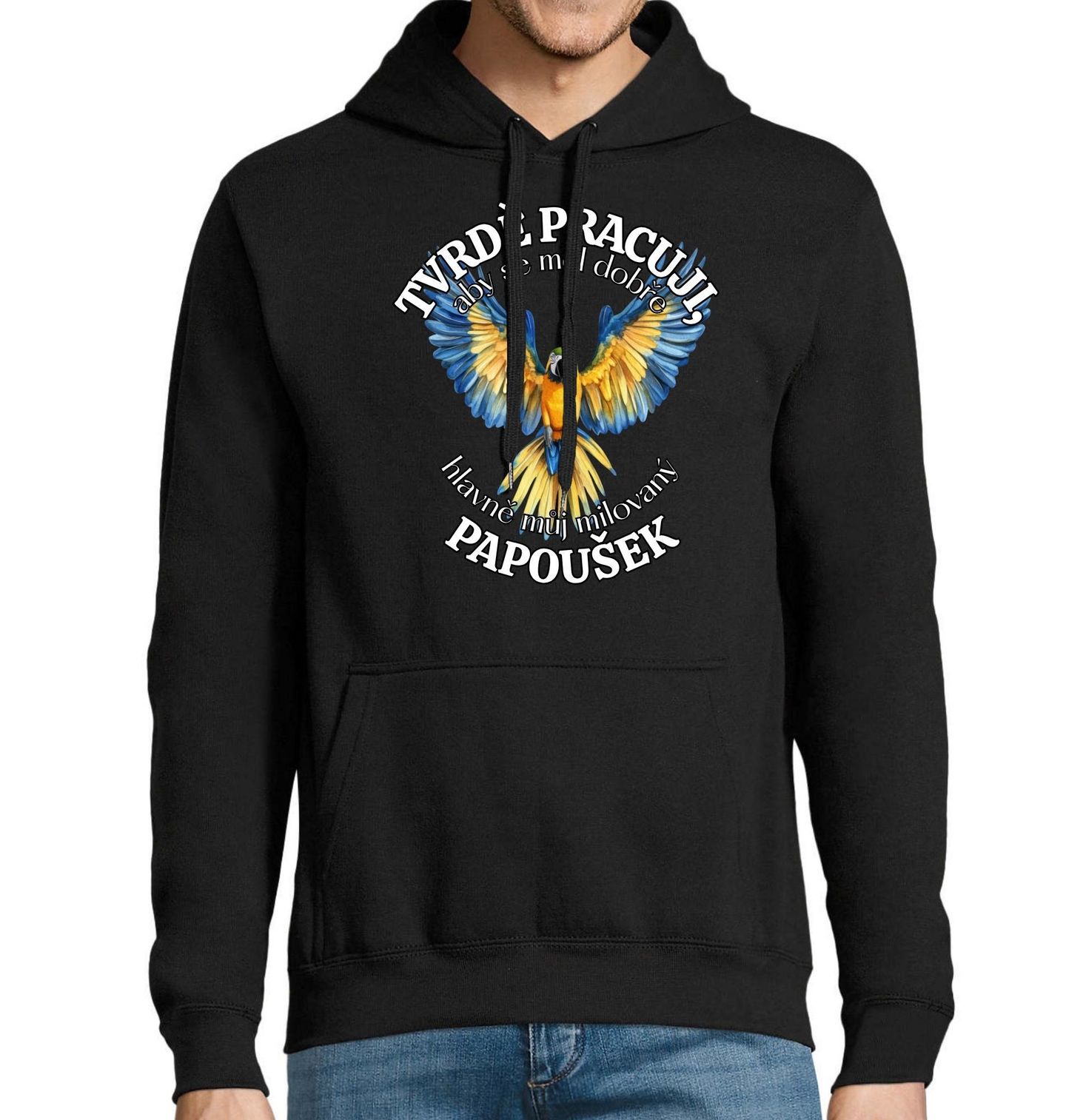 Pánská mikina Tvrdě pracuji, aby se měl dobře můj Papoušek Ara modrožlutý