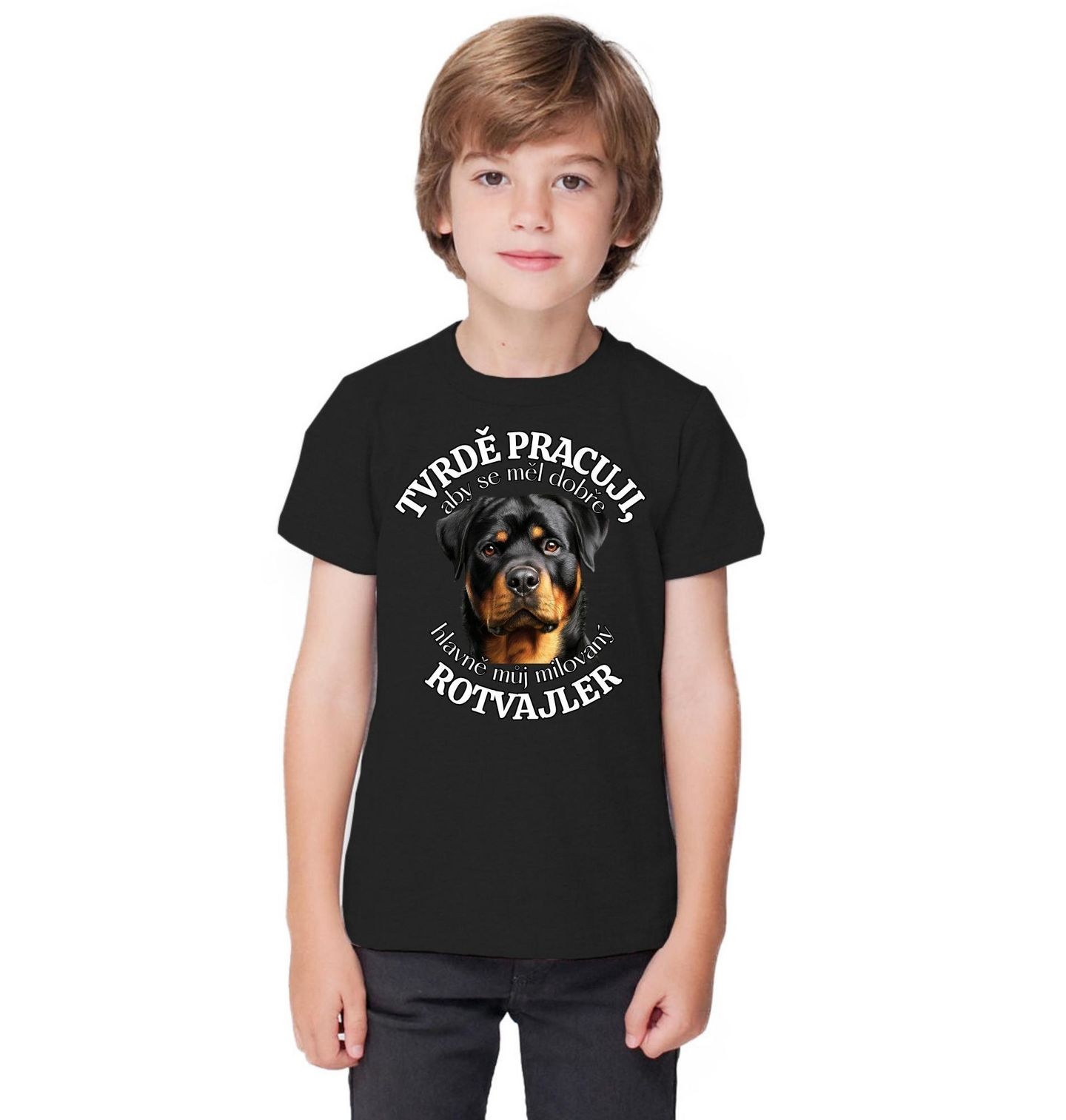 Dětské tričko Tvrdě pracuji, aby se měl dobře můj Rotvajler. Silný a výrazný motiv pro každého, kdo ví, že pes je nejen přítel, ale i ochránce. Tento design s plemenem rotvajler osloví každého, kdo je hrdý pejskař a váží si oddanosti svého psa. Rotvajler je respektovaná rasa psa známá svou věrností, inteligencí a ochranářským instinktem. Ideální volba pro všechny, kteří chtějí ukázat, že jejich pes má v životě to nejlepší a že vztah mezi člověkem a psem je pevný a jedinečný.