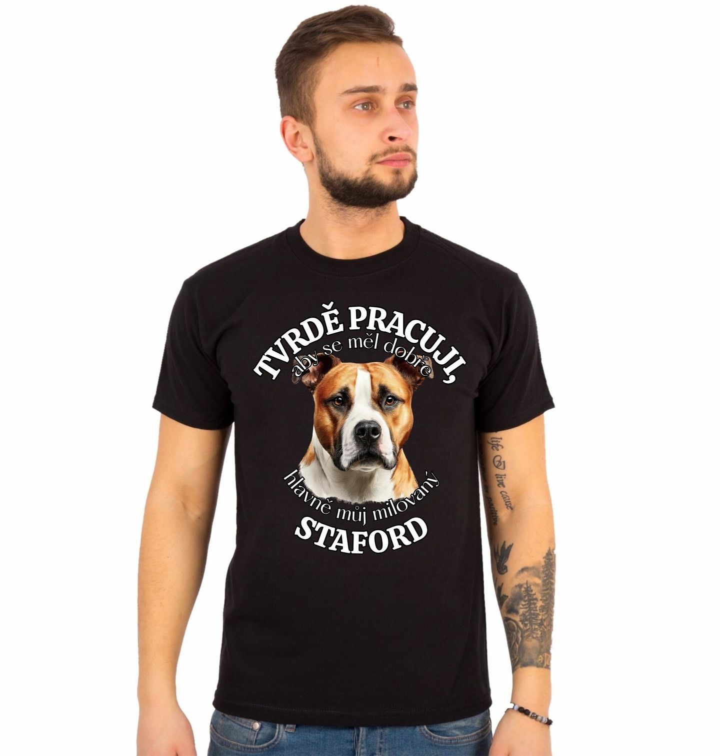 Pánské tričko Tvrdě pracuji, aby se měl dobře můj Staford. Tento design s motivem plemene staford (americký stafordšírský teriér) potěší každého, kdo je hrdý pejskař a miluje svého čtyřnohého parťáka. Výrazný portrét a silné sdělení skvěle vystihují vztah mezi člověkem a jeho psem. Ideální jako dárek pro každého, kdo má doma tohoto úžasného psa a chce dát světu najevo, že pro svého staforda udělá maximum.