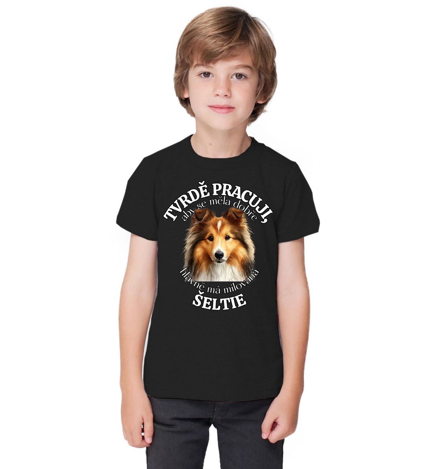 Dětské tričko Tvrdě pracuji, aby se měla dobře má Šeltie. Originální motiv pro všechny, kteří vědí, že pes je právoplatný člen rodiny. Tento design s plemenem šeltie (Sheltie – shetlandský ovčák) zaujme svým jemným a inteligentním výrazem. Ideální pro každého, kdo je hrdý pejskař a miluje svého oddaného psa. Šeltie je známá svou chytrostí, věrností a přátelskou povahou, což z ní dělá skvělého společníka.