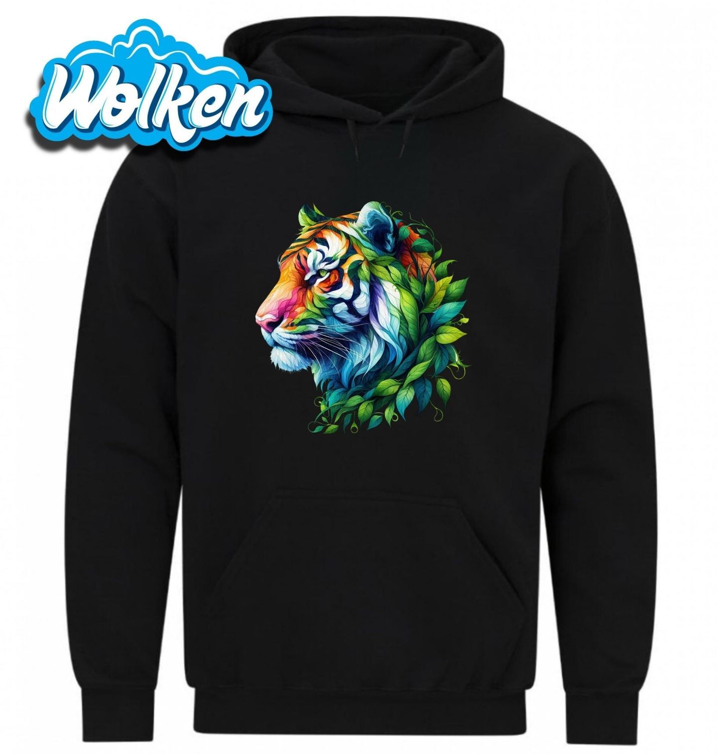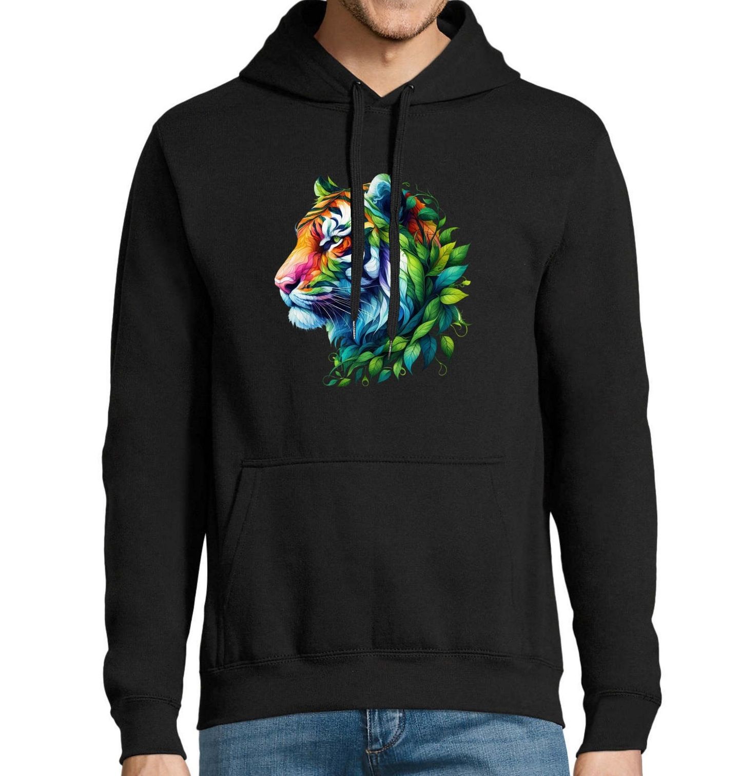 Pánská mikina Tygří Pohled lovce. Tento tygr není jen šelma – je to duše džungle, co se vznáší mezi listy a květinami. Jeho pohled je klidný, ale silný. Pestrobarevné tóny se mísí s listy jako by byl stvořen samotnou přírodou.