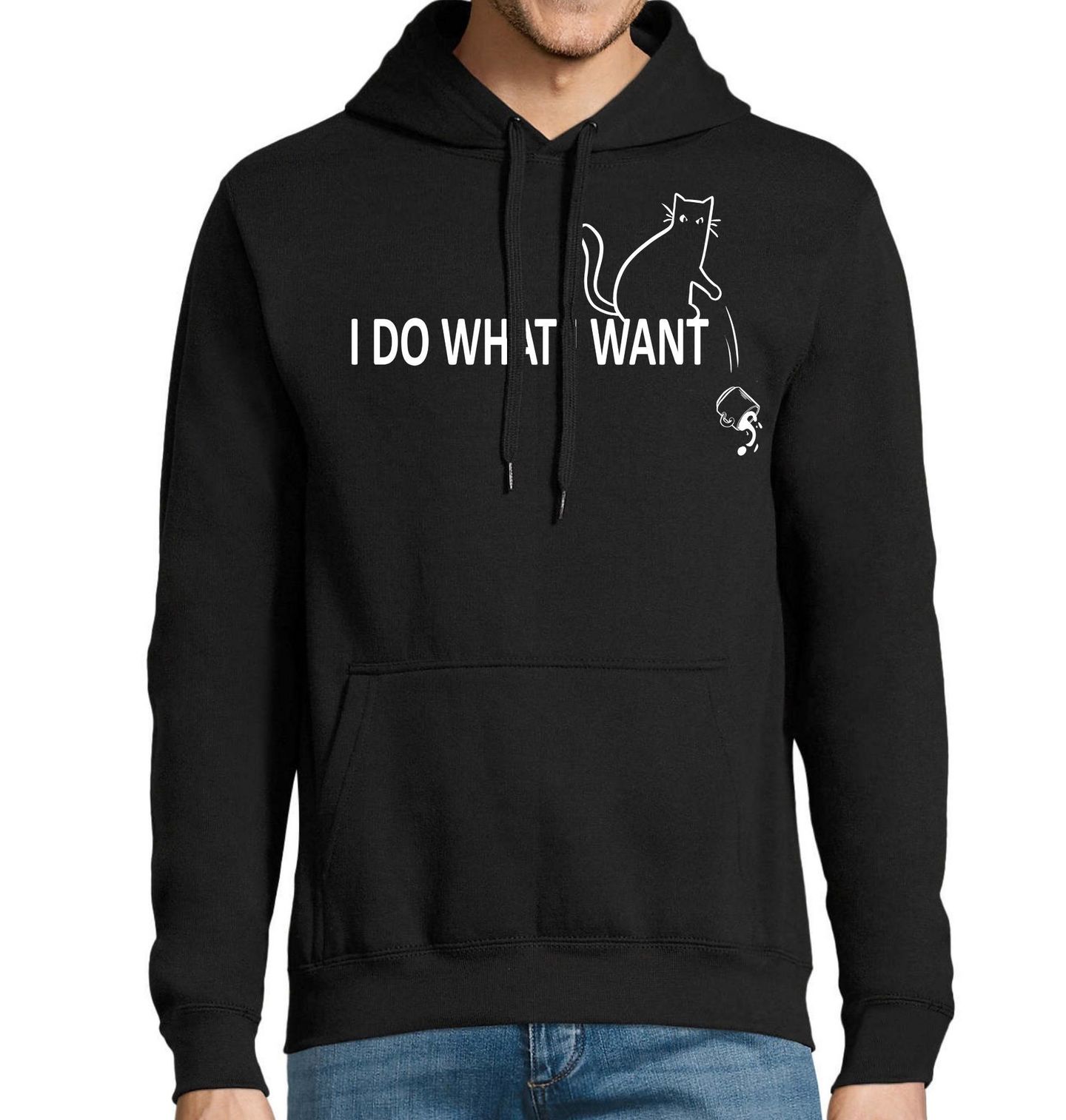 Pánská mikina Typická Kočičí Povaha Dělám si co Chci. Minimalistická ilustrace s kočkou a textem „I DO WHAT I WANT“ (Dělám si, co chci) vystihuje typickou kočičí povahu. Scéna s padajícím hrnkem dodává humor a autenticitu. Skvělé pro milovníky koček.