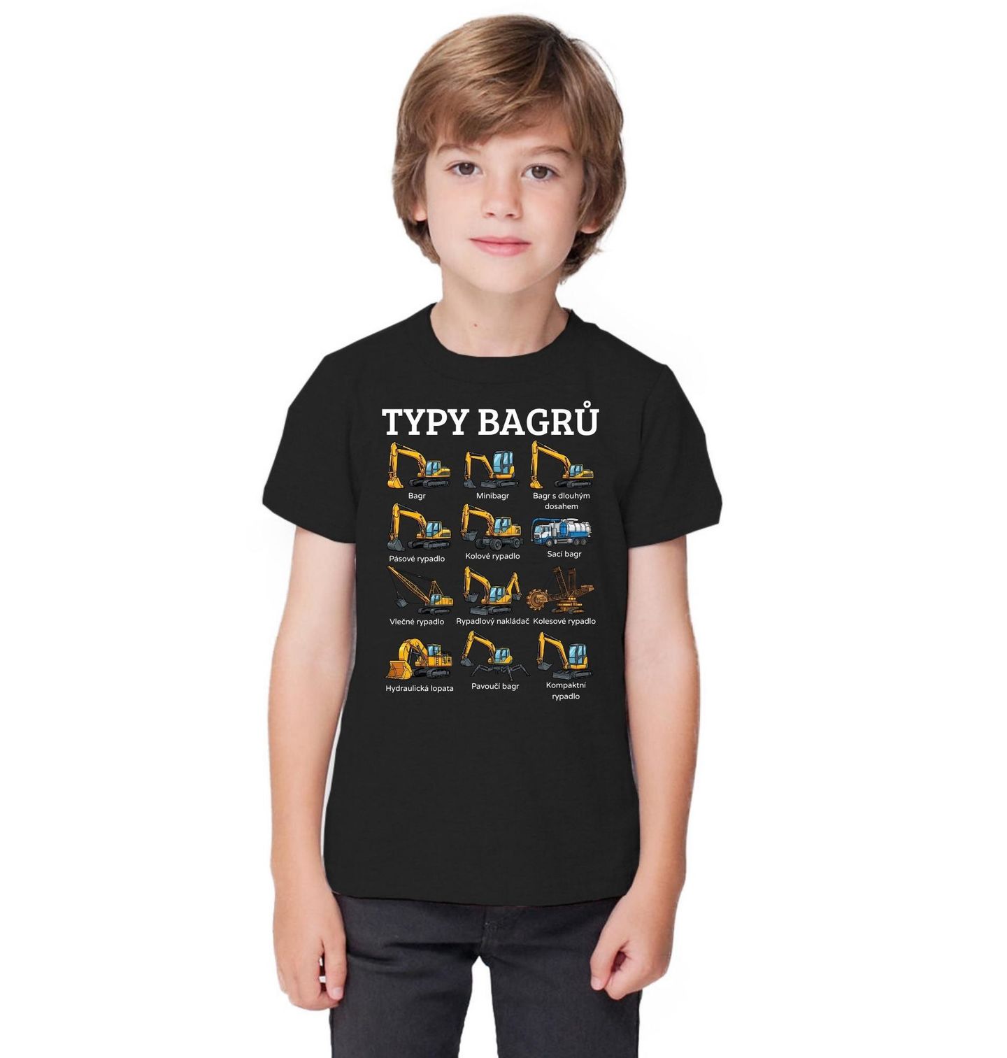 Dětské tričko Typy Bagrů. Každý bagr má své specifické využití a konstrukci, což tento design skvěle ukazuje. Na motivu najdeš různé varianty jako bagr, minibagr, bagr s dlouhým dosahem, pásové rypadlo, kolové rypadlo, sací bagr, vlečné rypadlo, rypadlový nakládač, kolesové rypadlo, hydraulická lopata, pavoučí bagr a kompaktní rypadlo. Díky tomu získáš přehled o tom, jaký bagr se používá pro různé typy prací.