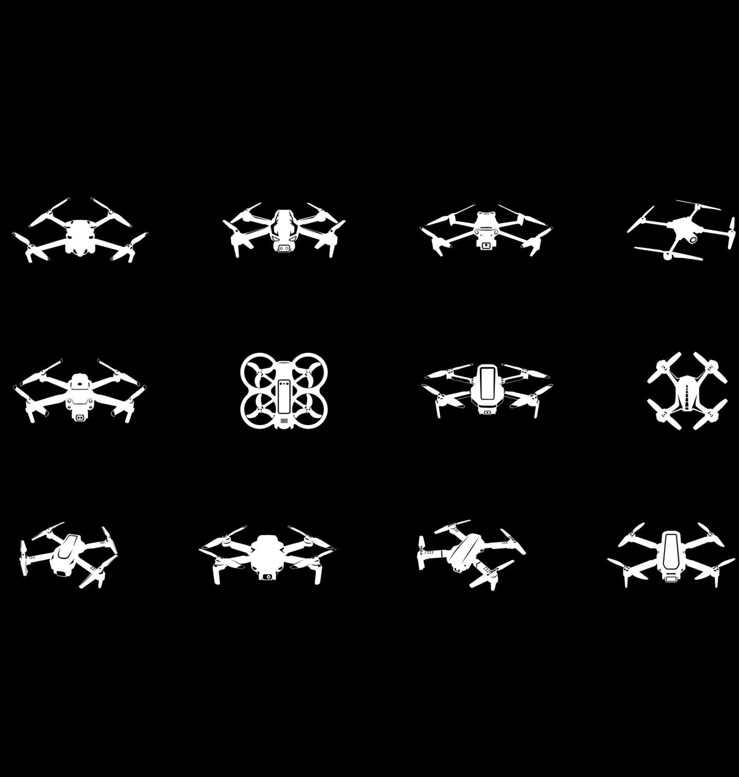 Dětské tričko Typy Dronů. Motiv zobrazuje přehled různých drony ve formě čistých bílých siluet na tmavém pozadí. Jednotlivé ilustrace představují rozdílné konstrukční varianty bezpilotních letounů – od klasických kvadrokoptér přes kompaktní skládací modely až po sportovní a FPV styl provedení.