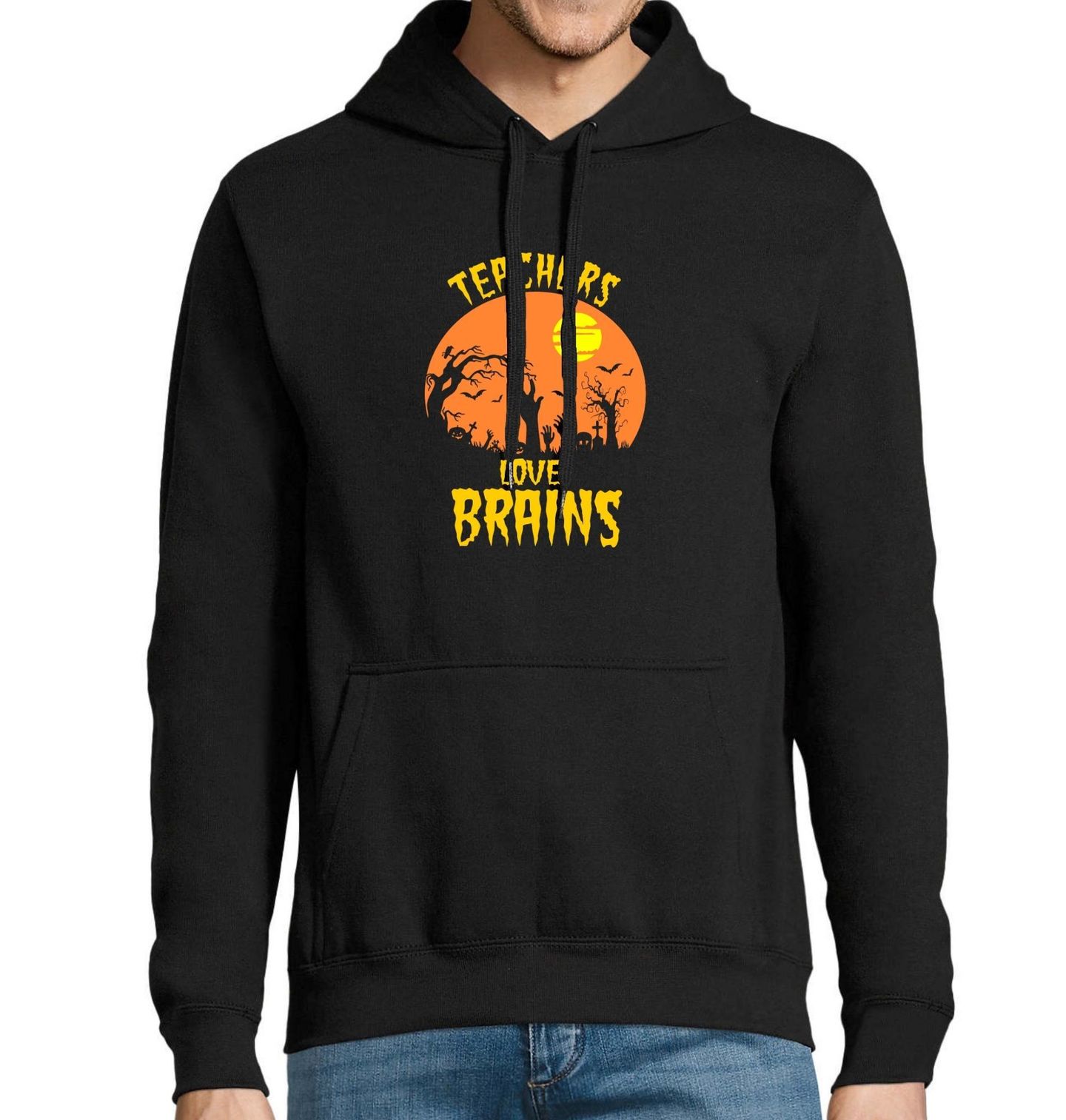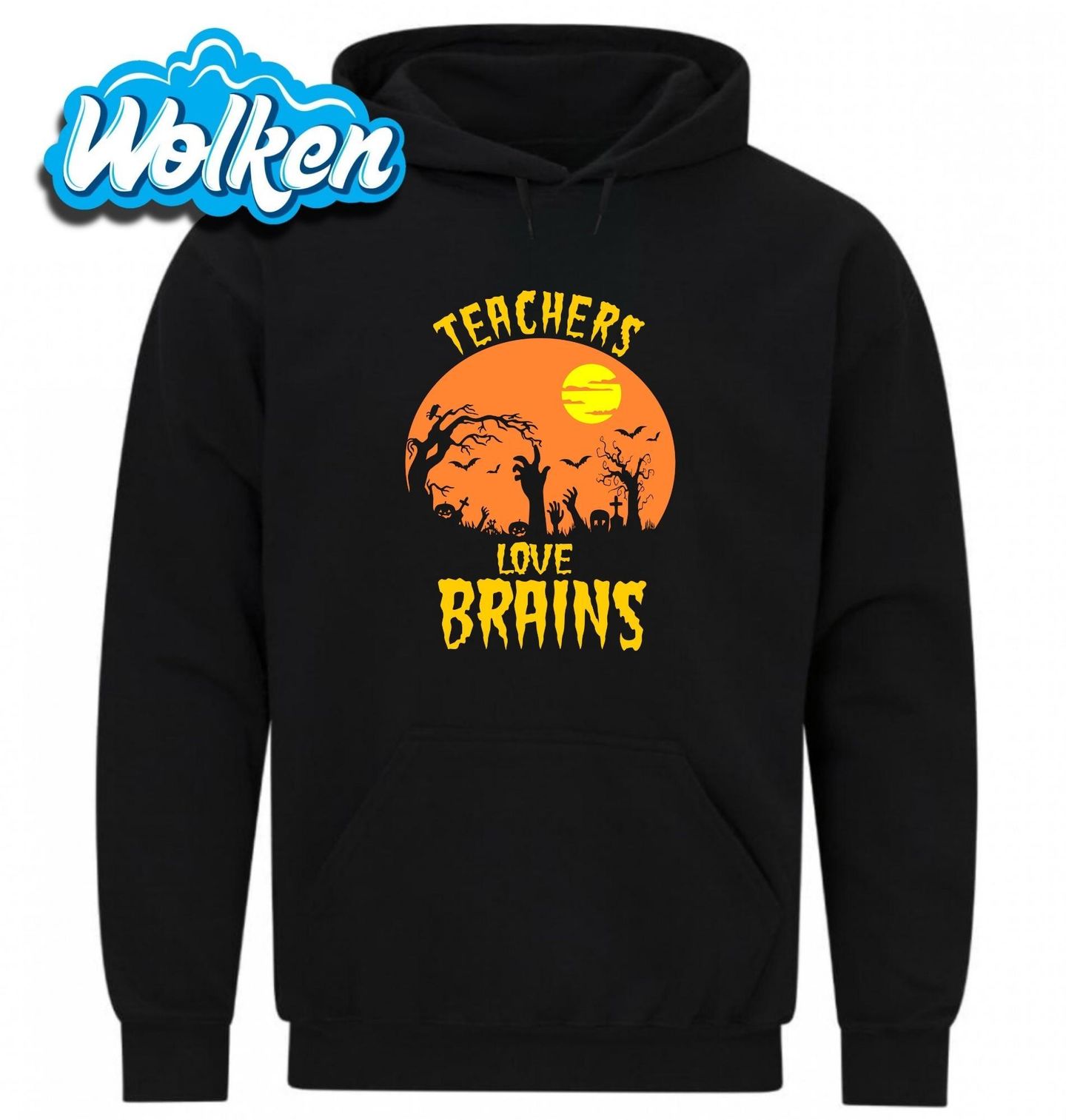 Pánská mikina Učitelé Milují Mozky Teachers Love Brains. Slovní hříčka – učitelé "milují mozky" (protože vzdělávají, podporují myšlení a vědomosti), ale v typické zombie scéně na hřbitově to zároveň působí jako parodie na to, že zombíci doslova milují mozky jako potravu. Perfektní pro učitele, profesory, lektory i fanoušky Halloween stylu a černého humoru.