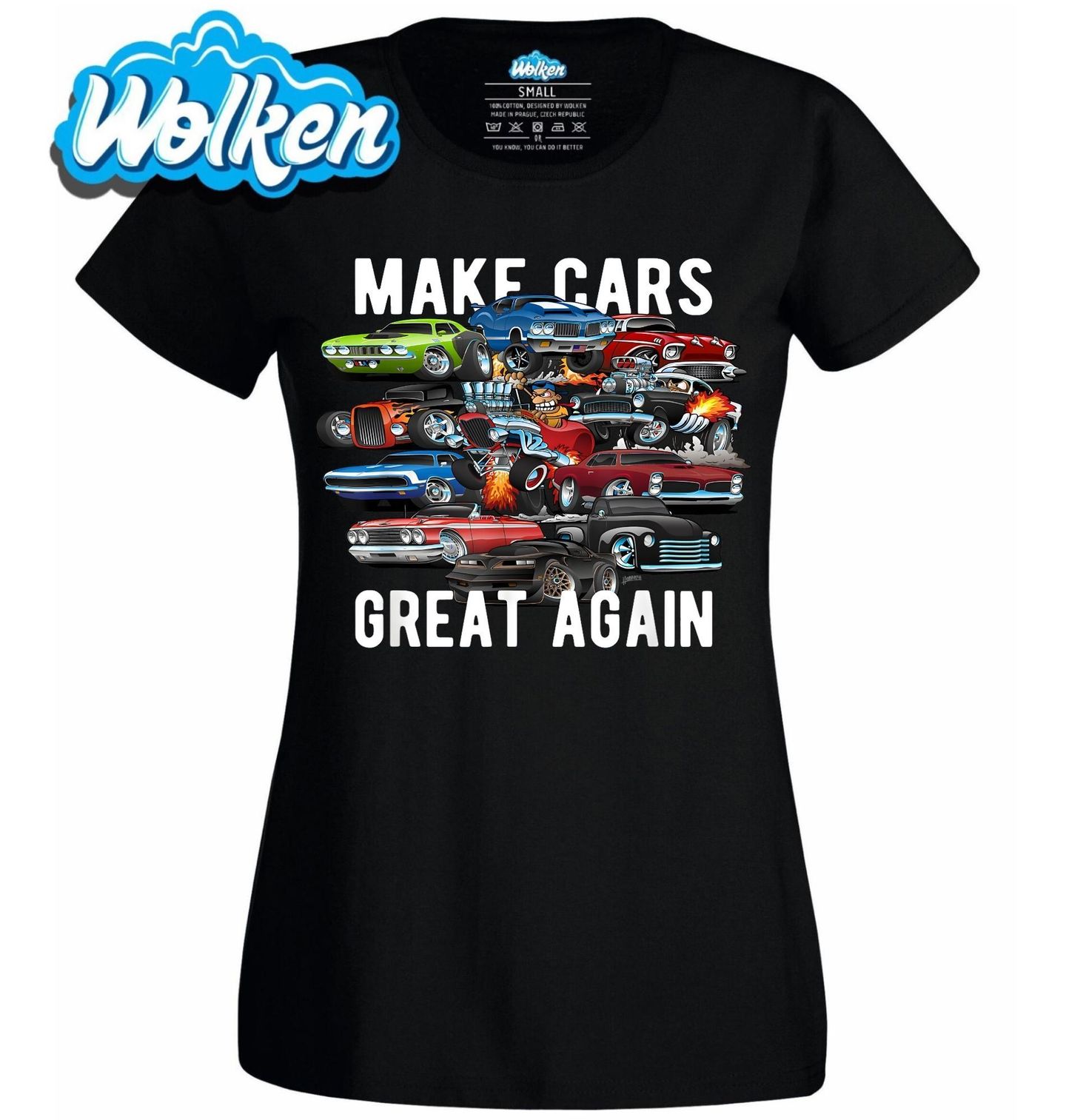Dámské tričko Udělejme Auta zase Skvělá. „Make Cars Great Again“ oslavuje klasická americká auta v jejich nejikoničtější podobě – s plameny, chromem, silou a duší, která v dnešních elektromobilech chybí. Skvělý dárek pro všechny fanoušky muscle cars, hot rodů a automobilové historie.