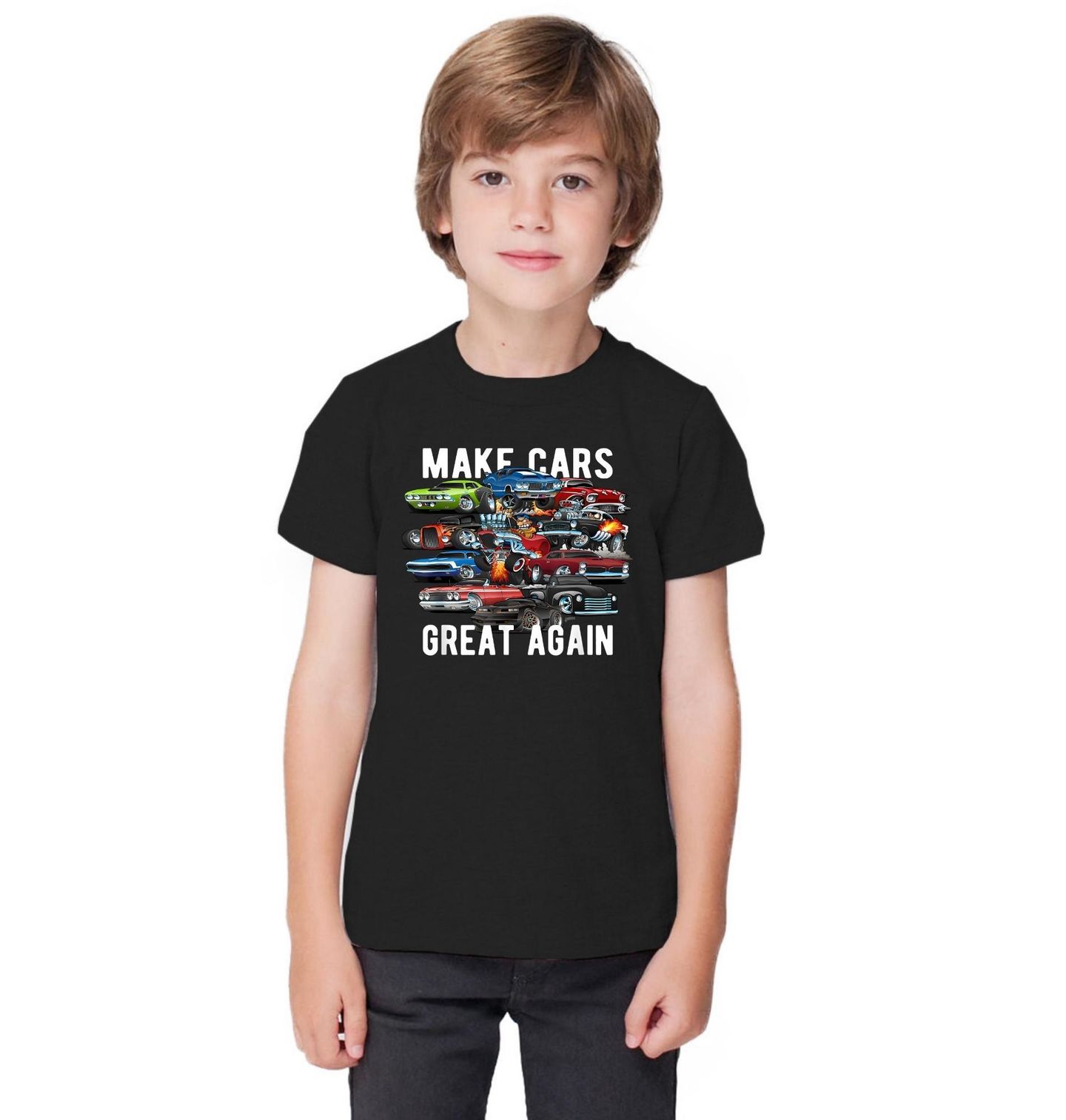 Dětské tričko Udělejme Auta zase Skvělá. „Make Cars Great Again“ oslavuje klasická americká auta v jejich nejikoničtější podobě – s plameny, chromem, silou a duší, která v dnešních elektromobilech chybí. Skvělý dárek pro všechny fanoušky muscle cars, hot rodů a automobilové historie.