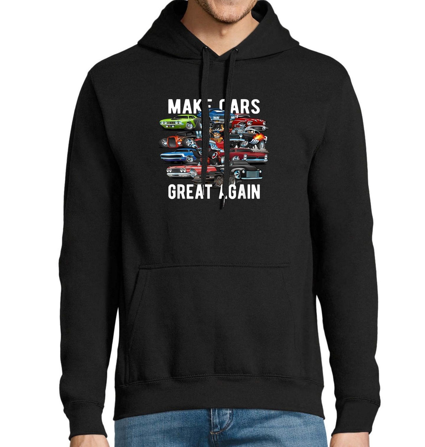 Pánská mikina Udělejme Auta zase Skvělá. „Make Cars Great Again“ oslavuje klasická americká auta v jejich nejikoničtější podobě – s plameny, chromem, silou a duší, která v dnešních elektromobilech chybí. Skvělý dárek pro všechny fanoušky muscle cars, hot rodů a automobilové historie.