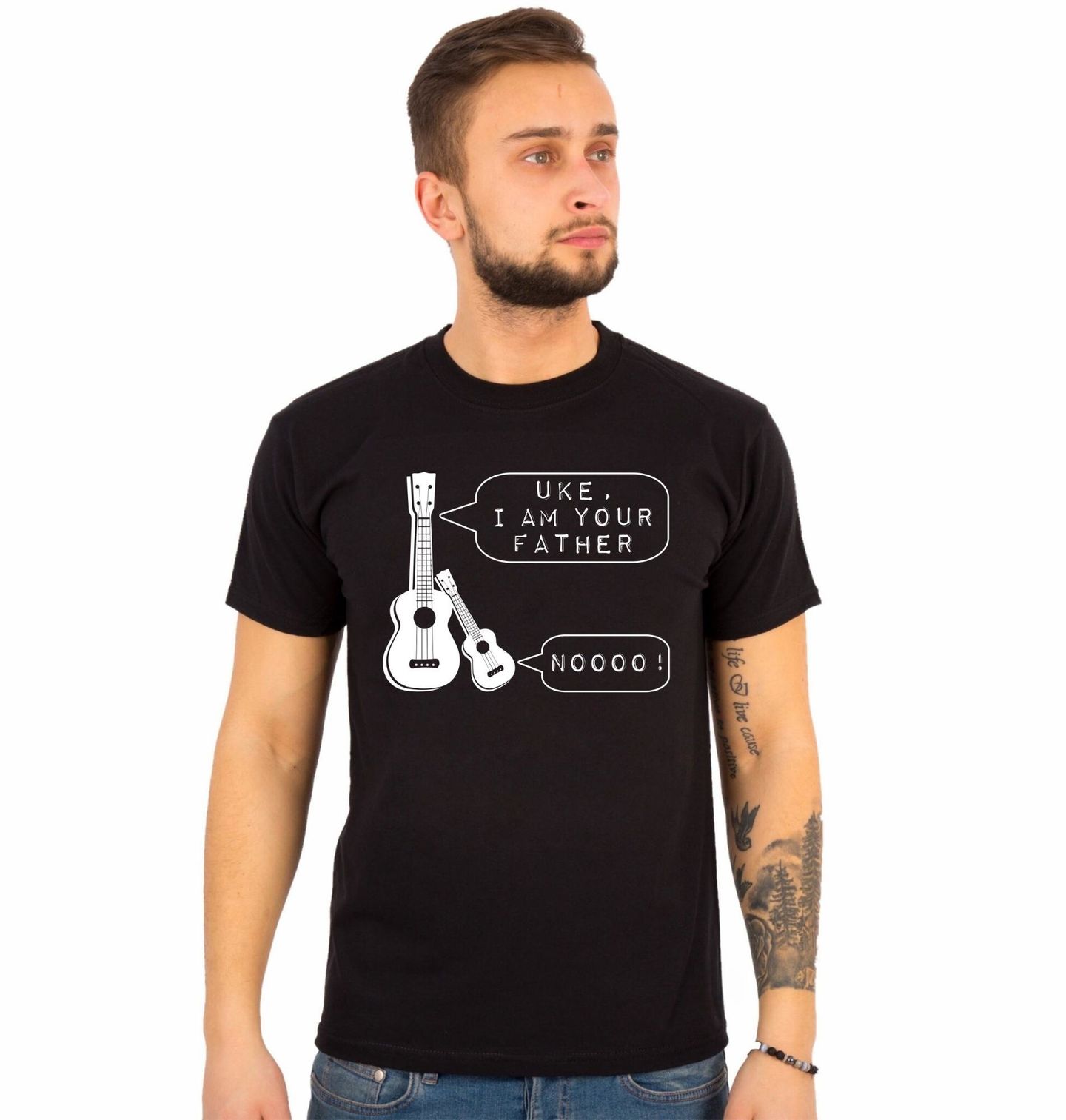 Pánské tričko Uke, I Am Your Father Star Wars. Vtipný hudební motiv s nástrojem ukulele, který si pohrává se slavnou filmovou hláškou ze Star Wars (Hvězdné války) a převádí ji do světa hudby. Design zobrazuje dvě ukulele v komiksovém stylu s bublinami a textem „Uke, I am your father“ jako humornou parafrázi ikonické věty ze sci-fi ságy.