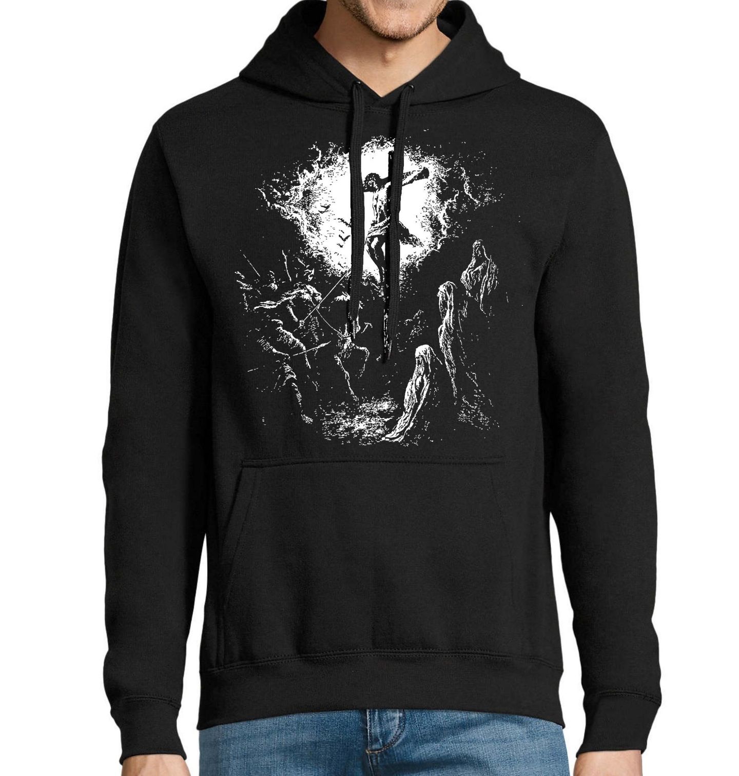 Pánská mikina Ukřižování Ježíše Krista. Silný design zobrazuje ukřižovanou postavu obklopenou dramatickými prvky a kontrastem světla a temnoty. Motiv symbolizuje víru, oběť a duchovní hloubku. Tento design osloví milovníky symboliky a výrazného uměleckého stylu.