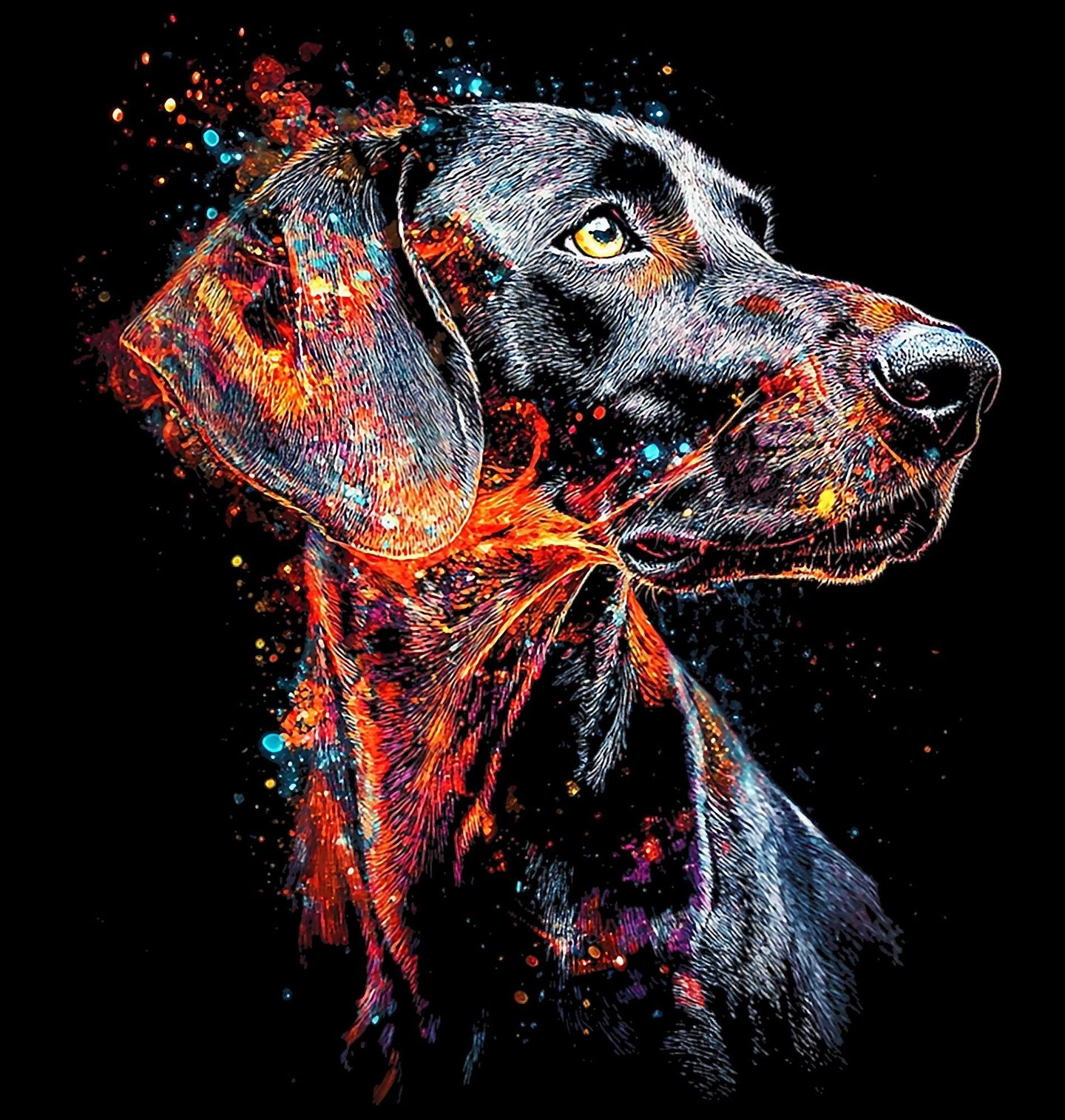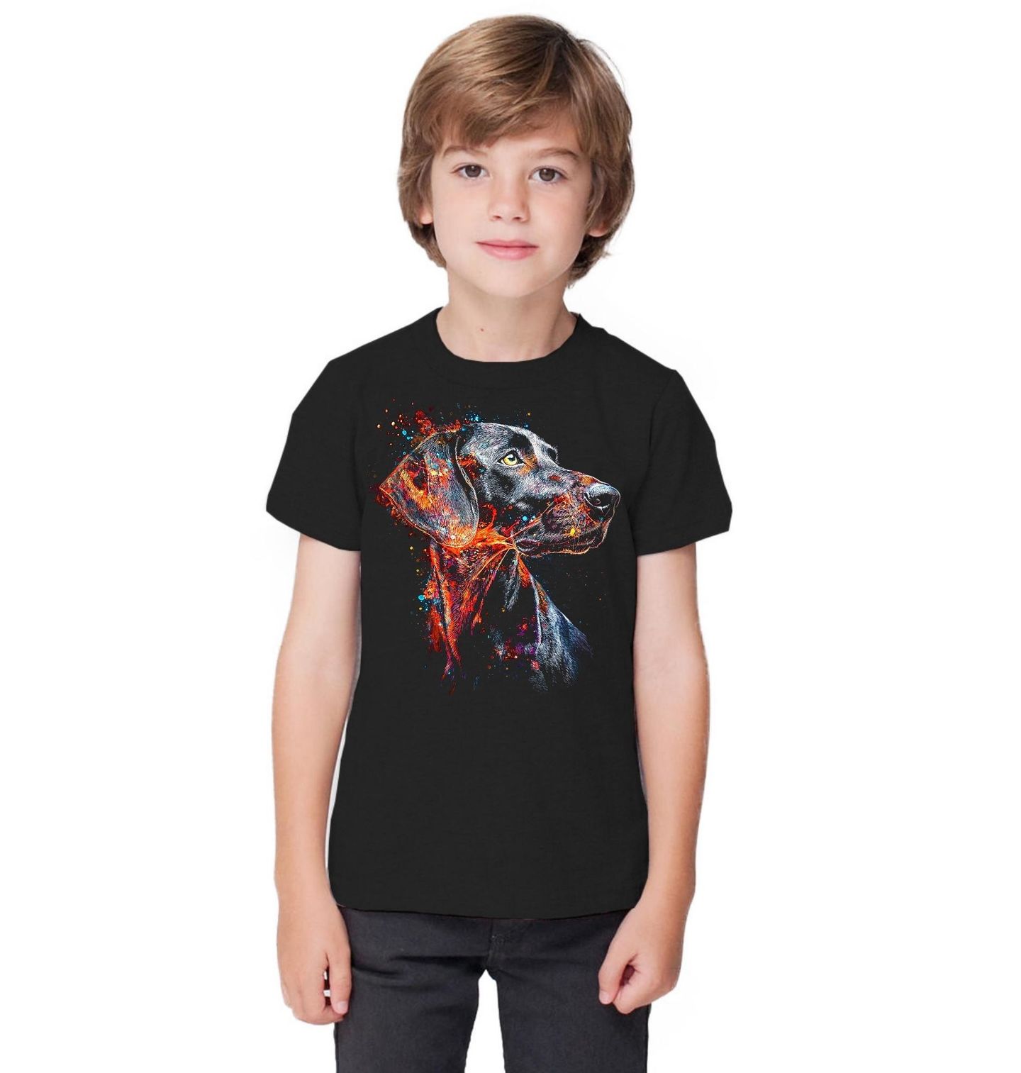 Dětské tričko Umělecký Portrét Psa Německý ohař krátkosrstý. Tento výrazný design zachycuje psa ve stylu barevné exploze, která podtrhuje jeho sílu, eleganci a jedinečnost. Plemeno labrador zde působí moderně a umělecky díky kontrastu tmavého pozadí a zářivých barev, které vytvářejí dynamický vizuální efekt. Ideální motiv pro milovníky psů a originálního umění.