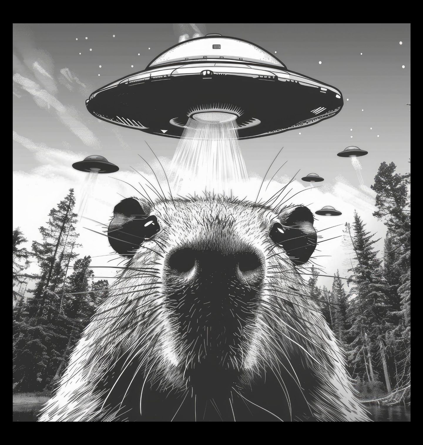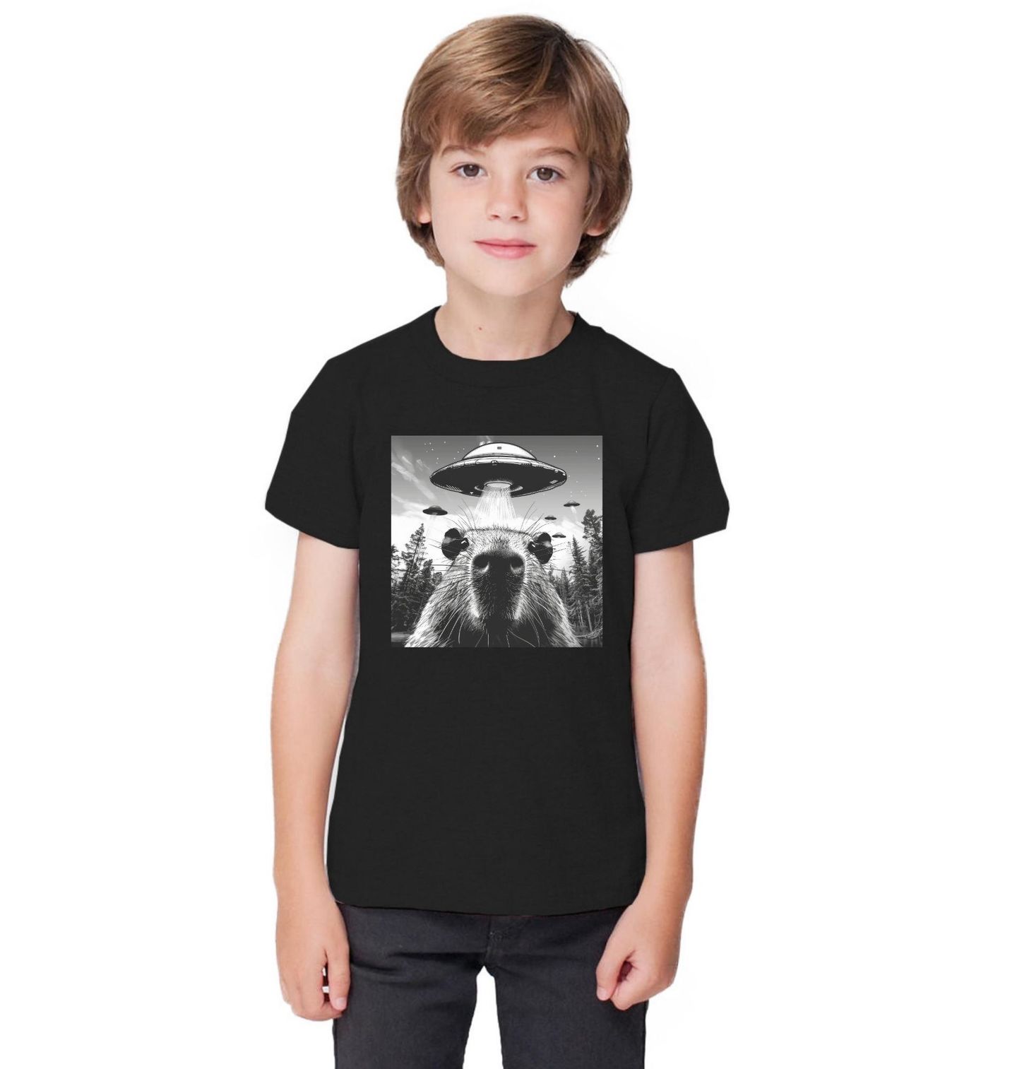 Dětské tričko Únos Kapybary UFO. Když se hlodavec stane svědkem něčeho, co rozum nepobírá – mimozemšťané sestupují z nebe uprostřed lesa! Tento surrealistický motiv zachycuje moment únosu v lesní krajině, kde kapybara čelí invazi UFO. Ideální pro fanoušky sci-fi, humoru a nejvíc chill zvířete na světě – kapybary.