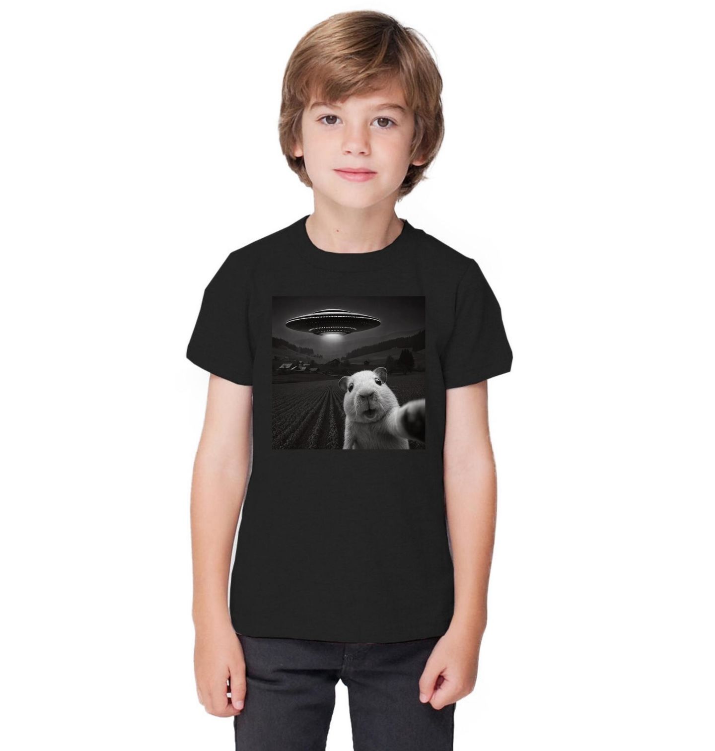Dětské tričko Únos Morčete UFO. Tohle morče tě zachrání před nudou – v hlavní roli morče, které si pořizuje selfie uprostřed pole… zatímco nad ním krouží UFO s mimozemšťany! Vánoce nebo ne, tihle návštěvníci z vesmíru právě přistáli – a morče má jasno: hlavně zaznamenat důkaz.