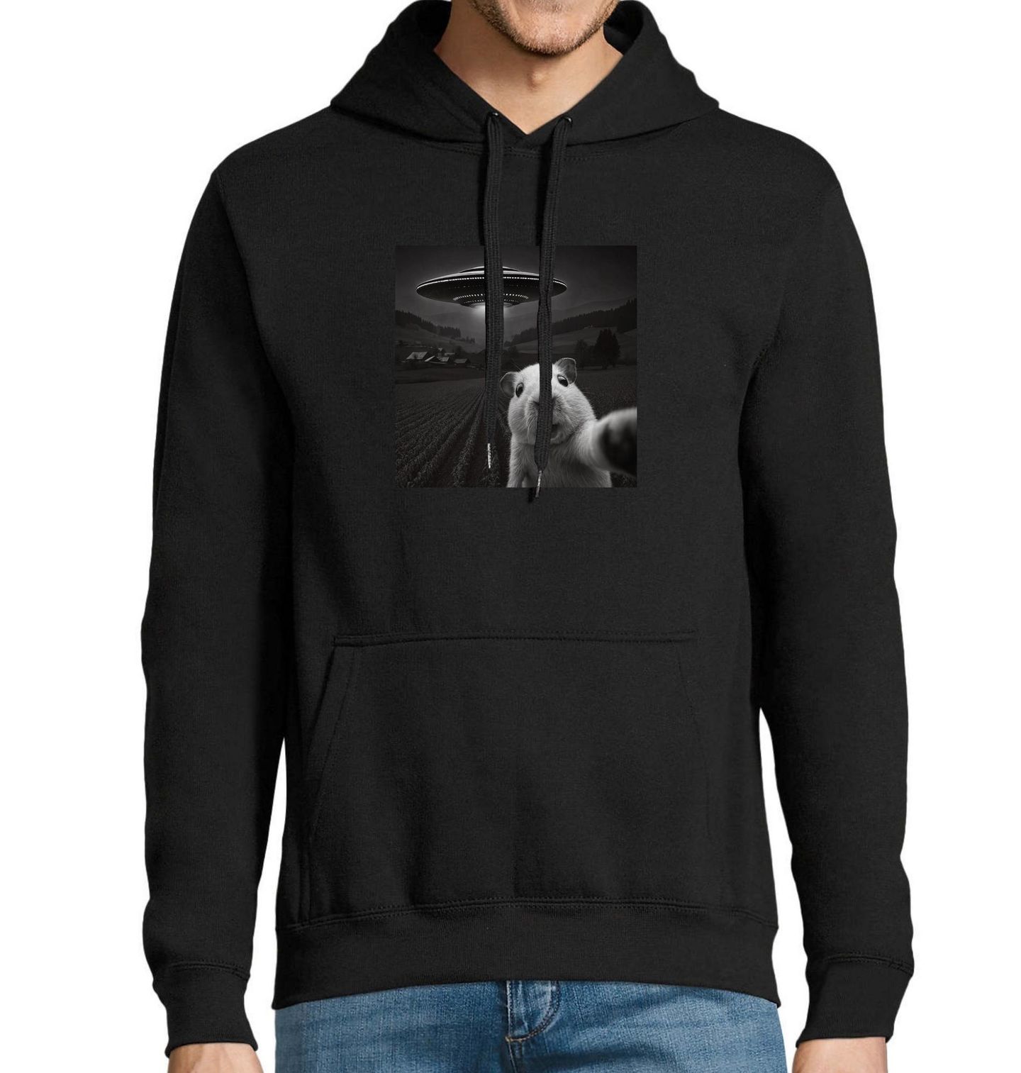 Pánská mikina Únos Morčete UFO. Tohle morče tě zachrání před nudou – v hlavní roli morče, které si pořizuje selfie uprostřed pole… zatímco nad ním krouží UFO s mimozemšťany! Vánoce nebo ne, tihle návštěvníci z vesmíru právě přistáli – a morče má jasno: hlavně zaznamenat důkaz.