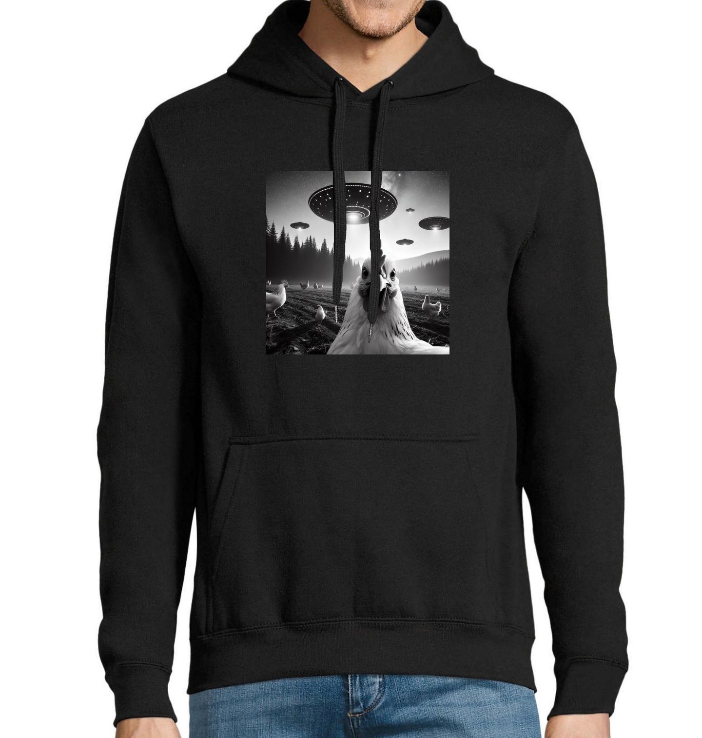 Pánská mikina Únos Slepice UFO. Slepice na farmě sledují přílet tajemných mimozemšťanů na palubách zářících UFO. Tento motiv kombinuje černobílou dramatickou atmosféru s ironickým humorem, takže je ideální pro každého, kdo miluje sci-fi, zvířata, a trochu té bizarní originality.