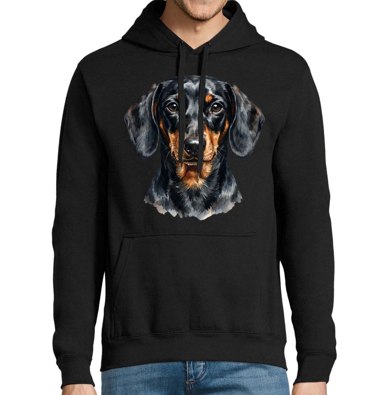 Pánská mikina Upřímný Pohled Jezevčíka. Tento realistický potisk zachycuje věrný pohled jezevčík v jemném akvarelovém provedení. Detailní stínování srsti a hluboké hnědé oči dodávají portrétu neuvěřitelný výraz a emoce. Tento kousek musí mít každý milovník toto inteligentní plemeno a fanoušek kvalitní ilustrace. Design působí elegantně a díky černému pozadí dokonale vynikne každý tah štětcem. Oslavte své pouto se čtyřnohým přítelem tímto stylovým motivem.